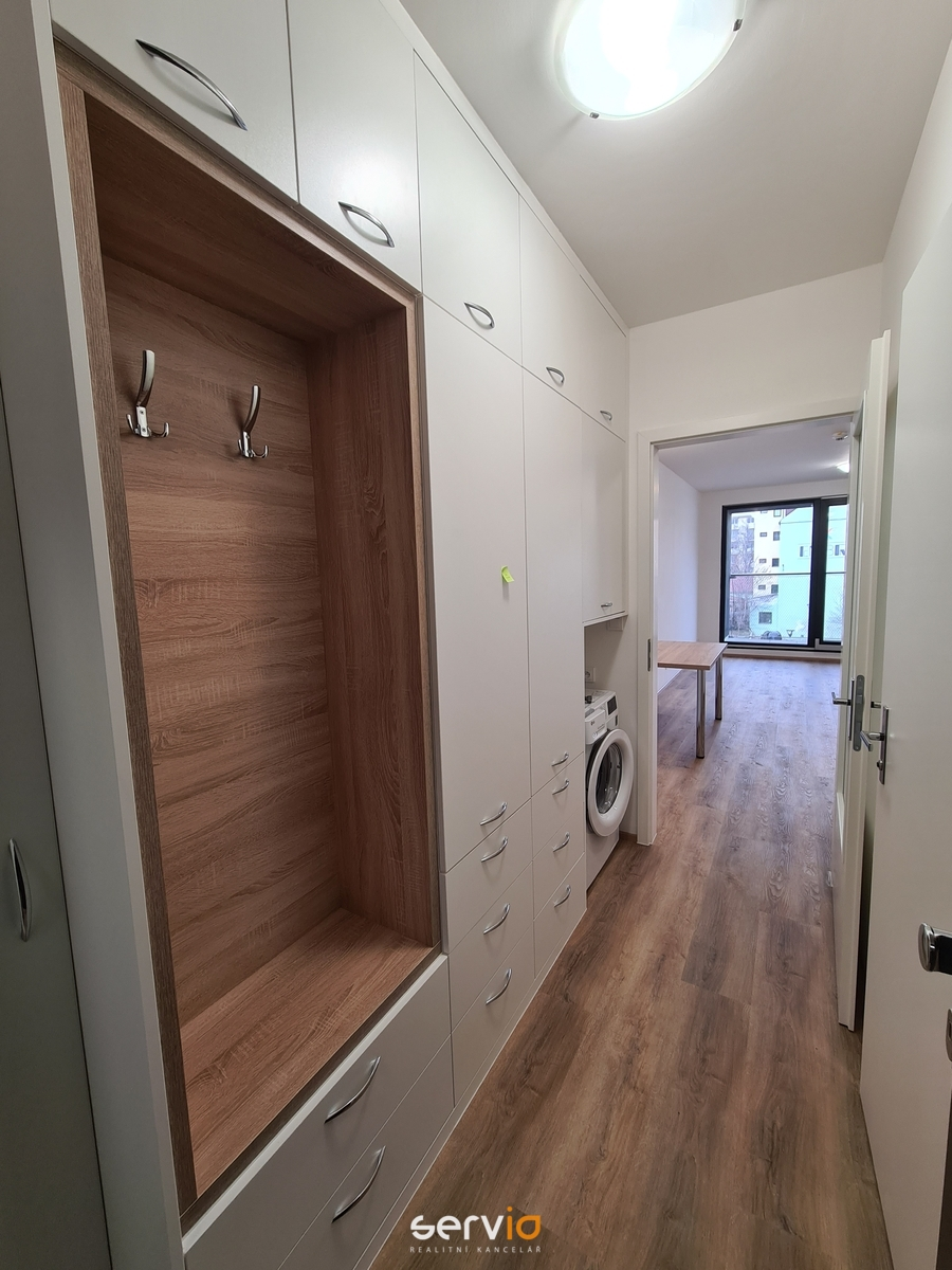 Součástí jednotky je moderně vybavená koupelna (sprcha nebo vana, WC, umyvadlo, galerka se zrcadlem, věšáky, pračka), kompletní KL včetně spotřebičů (myčka, trouba, sporák), vinylová podlaha, jídelní stůl a židle, možnost dovybavení postelí (jednolůžko, dvojlůžko), předsíňový nábytkový program, a další vybavení dle domluvy s majitelem. Fotky mohou být ilustrační, z podobného bytu. Ke každému bytu náleží sklep. Objekt zabezpečen kamerovým systémem. Možnost pronájmu krytého PS za poplatek 2.000,-Kč/měs. + DPH. Volné ihned.