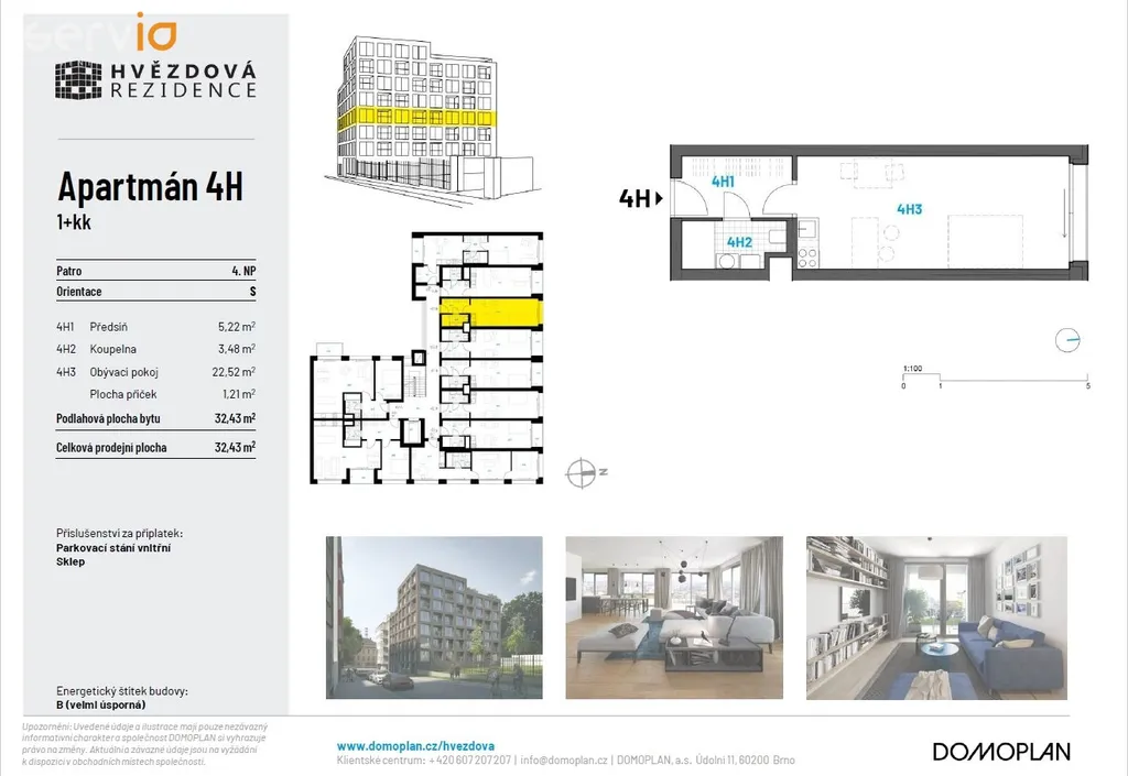 Nabízíme exkluzivně pronájem bytu 1+kk o velikosti 32,43 m2 se sklepem a možností pronájmu krytého PS v objektu Rezidence Hvězdová, polyfunkční dům obklopený městským parkem, odkud je to na brněnské náměstí Svobody procházkou deset minut.