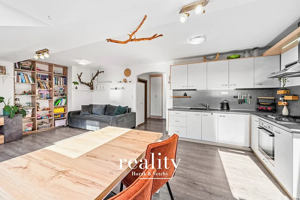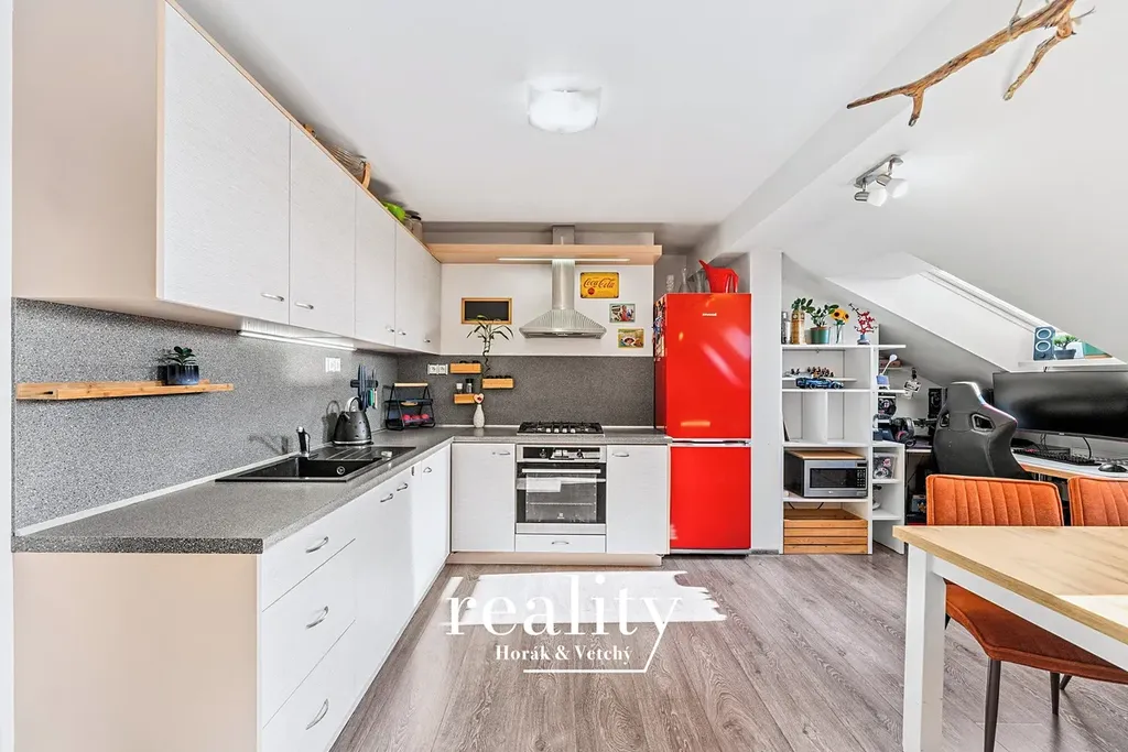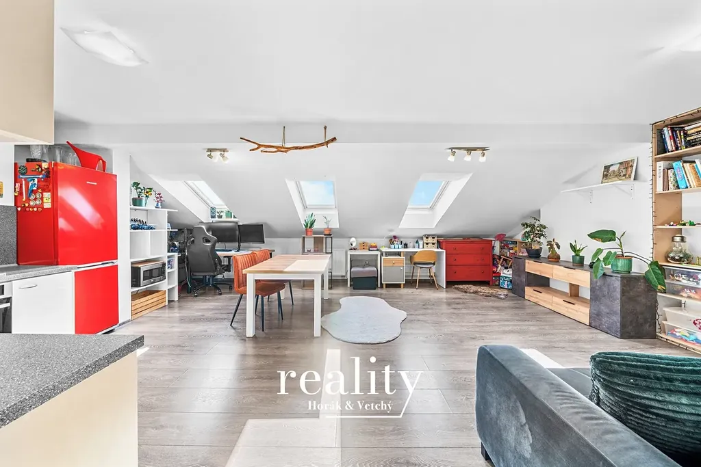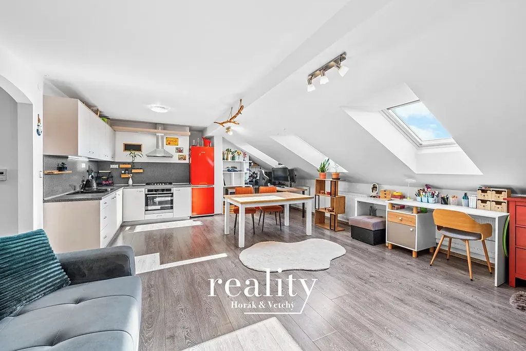Dominantou bytu je prostorný obývací pokoj s kuchyňským koutem, který díky třem střešním oknům orientovaným na jihovýchod působí velmi vzdušně a světlým dojmem. Kuchyňská linka je vybavena kombinovaným sporákem (plynová varná deska + elektrická trouba).