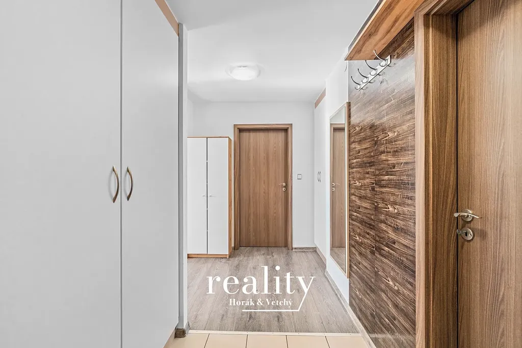 V koupelně se nachází vana, samostatný sprchový kout i toaleta. Praktickým bonusem jsou vestavěné skříně v předsíni, ložnici i obývacím pokoji, které poskytují nadstandardní úložné prostory.
