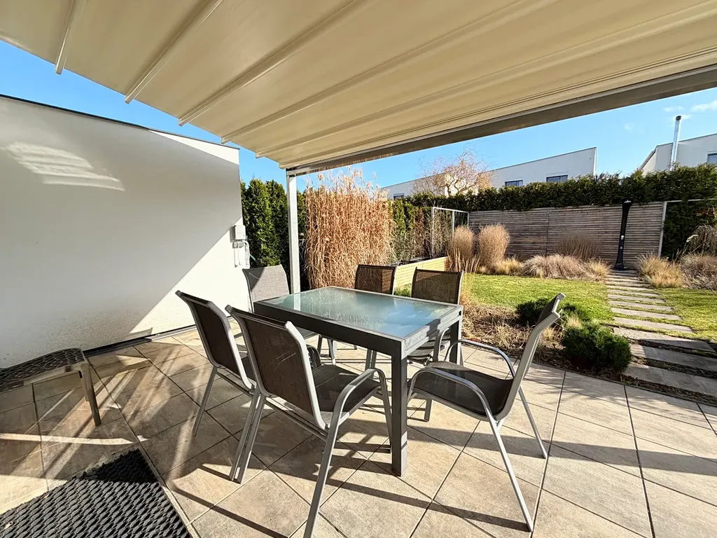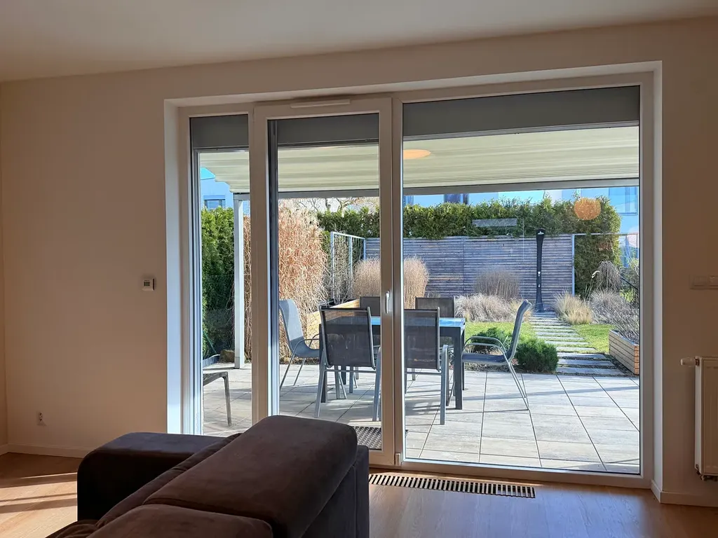 Nemovitost disponuje dvěma nadzemními podlažími s prakticky řešenou dispozicí. V přízemí se nachází prostorný obývací pokoj s kuchyňským a jídelním koutem s přímým vstupem na terasu s mobilně nastavitelným zastřešením vydlážděné terasy s grilem a udržovanou osázenou zahradou, dále je v přízemí komora, pracovna, toaleta a vstupní chodba. Součástí je také garáž pro jeden automobil, ze které projdete do bytu i na zahradu.