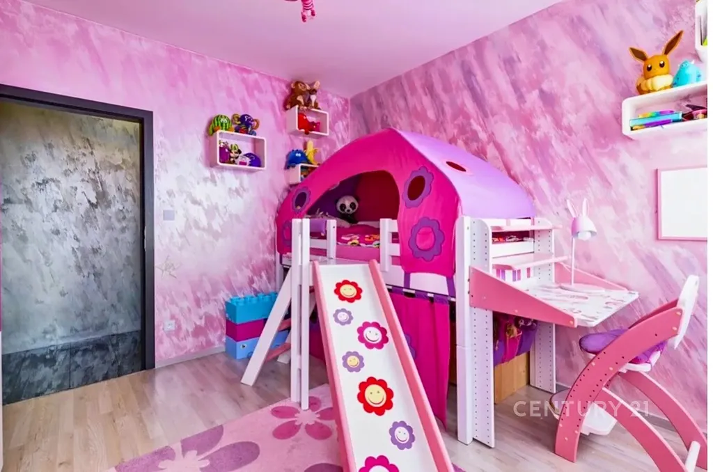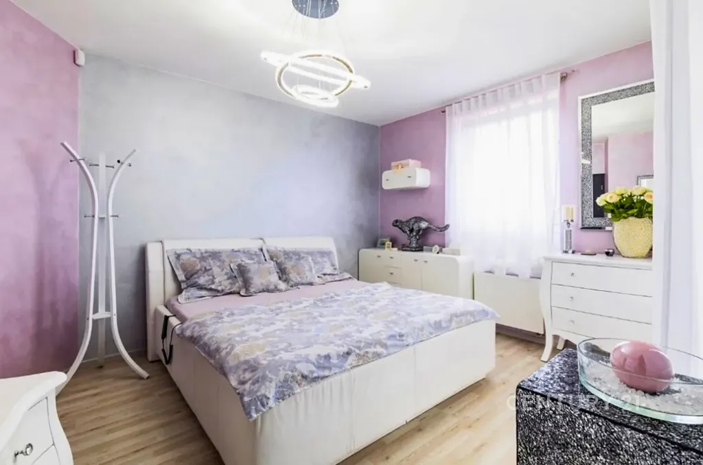 Další dvě ložnice nabízí komfortní čtvercový půdorys pro snadné zařízení nábytkem. Větší z ložnic má vstup na menší terasu a vestavěnou šatnu v originální lila barvě.
