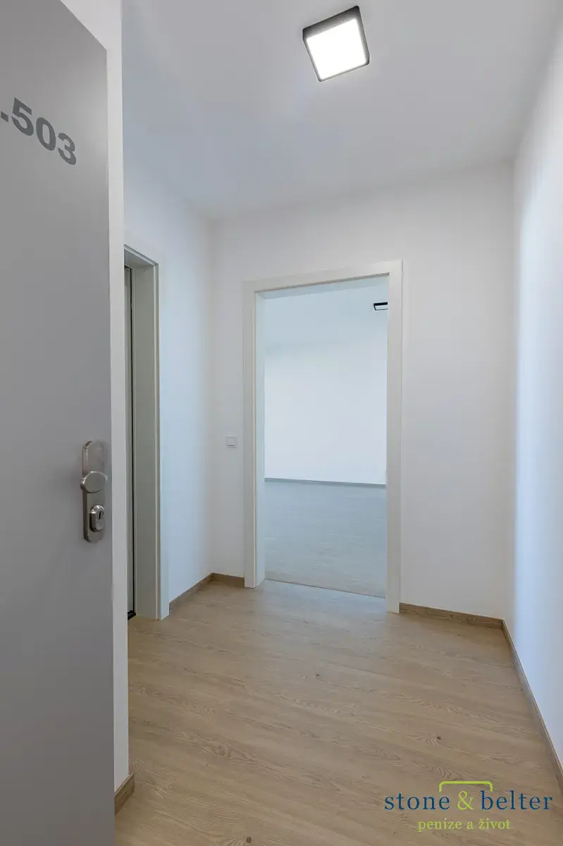 Byt zaujme světlým a vzdušným interiérem, prostornou vstupní chodbou, velkoryse řešenou koupelnou a příjemným propojením obytné části s venkovním prostorem. Hlavní obytná místnost je propojena s lodžií o velikosti cca 12,5 m² prostřednictvím velkoformátového proskleného portálu, který zajišťuje dostatek denního světla a příjemnou atmosféru.