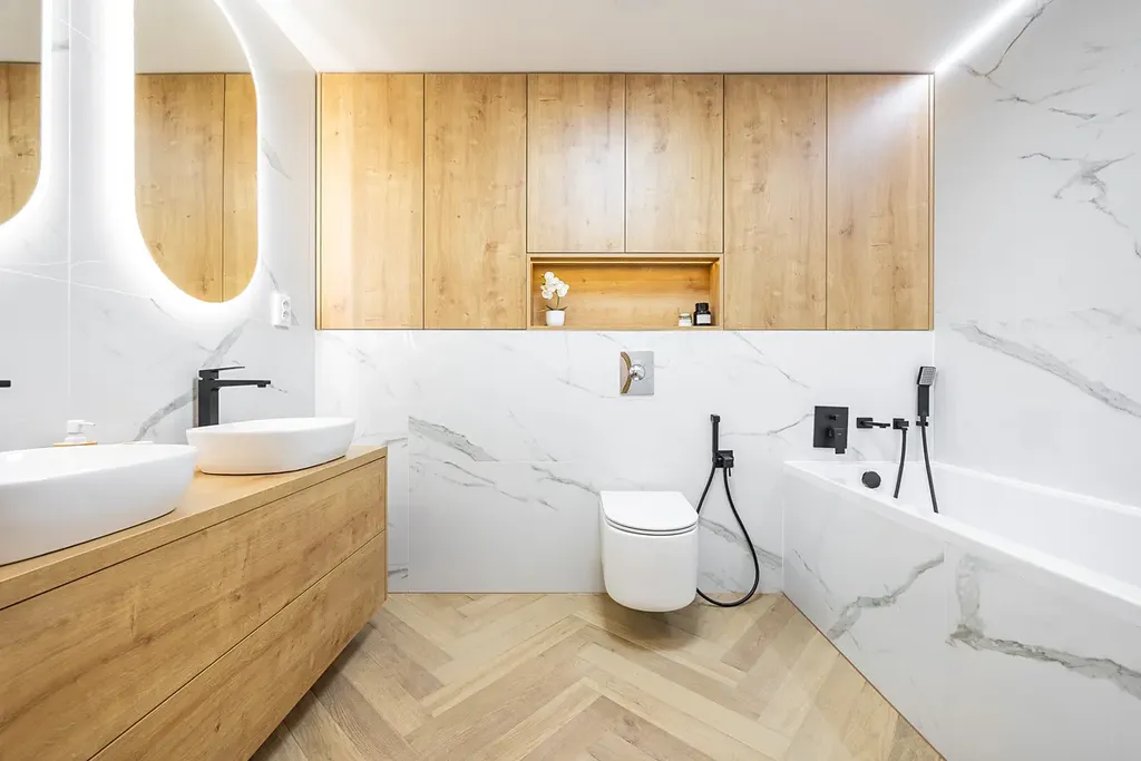 - nová sanita (vana, sprcha, umyvadlo, skříňka, toaleta) s podomítkovými bateriemi