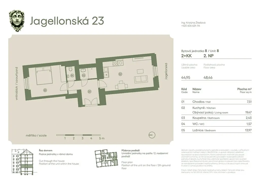 Nabízíme k prodeji bytovou jednotku o dispozici 2+kk a celkové podlahové ploše 48,46 m² ve 2.NP, situovanou v rezidenčním projektu Jagellonská 23 na rozhraní Vinohrad a Žižkova.