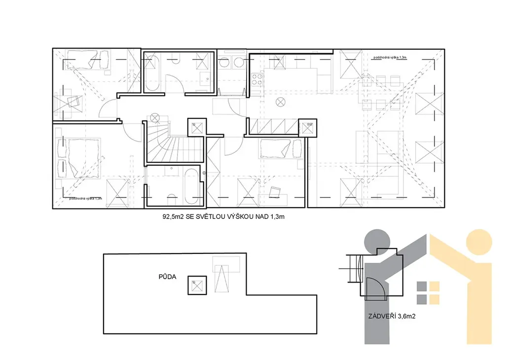 Byt má 120,3m2 podlahovou plochu. Užitná plocha je 96,1m2, přičemž v ní není započítána plocha půdy a ani plocha pod střešními okny. Reálně tedy budoucí majitelé získají mnohem více, než 120m2 plochy k užitku.