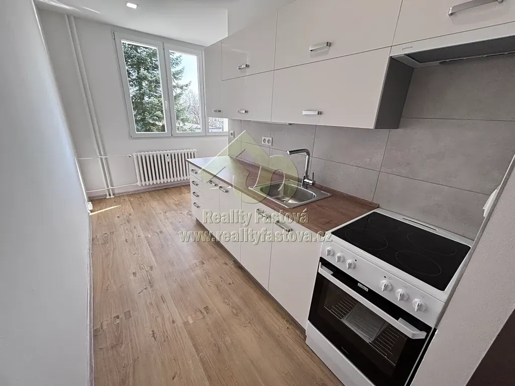 V kuchyni je k dispozici nová kuch.linka s dřezem a el.sporákem s el. troubou. V celém bytě jsou položena lina, do pokojů osazeny nové dveře, nová výmalba stěn a plastová okna.