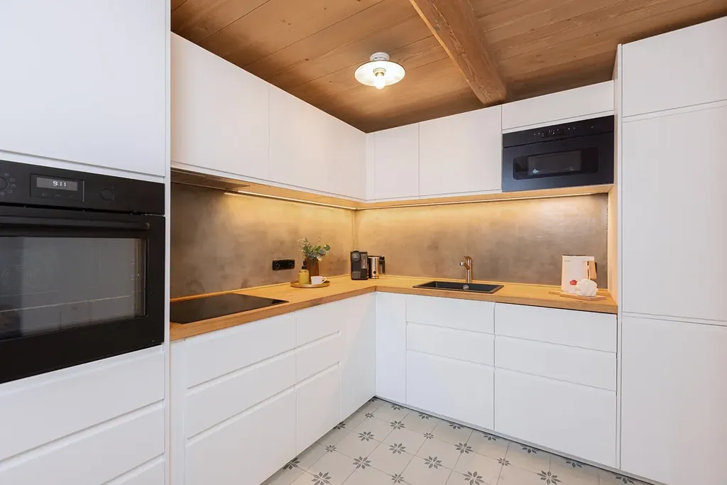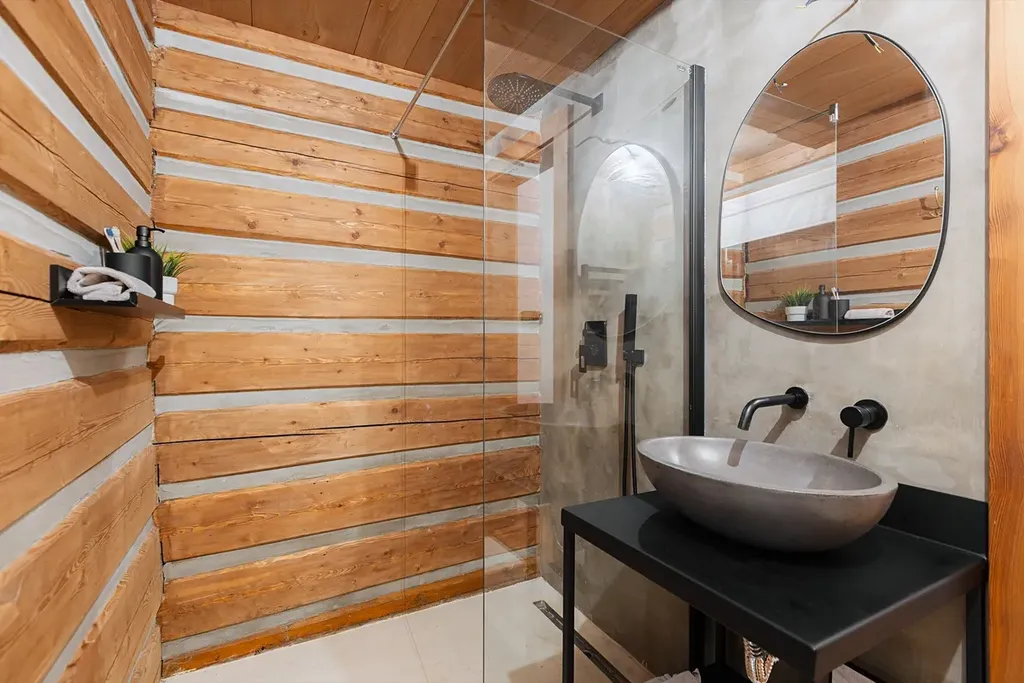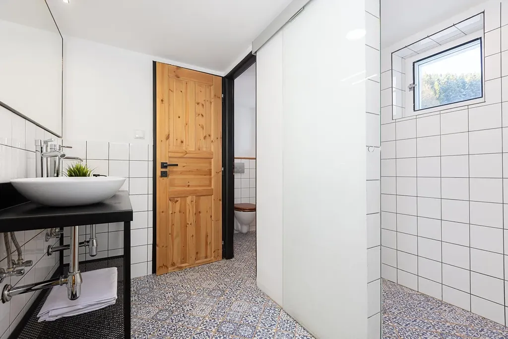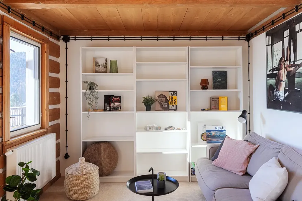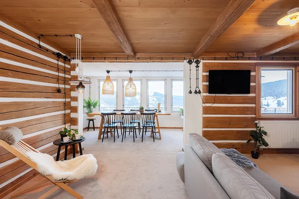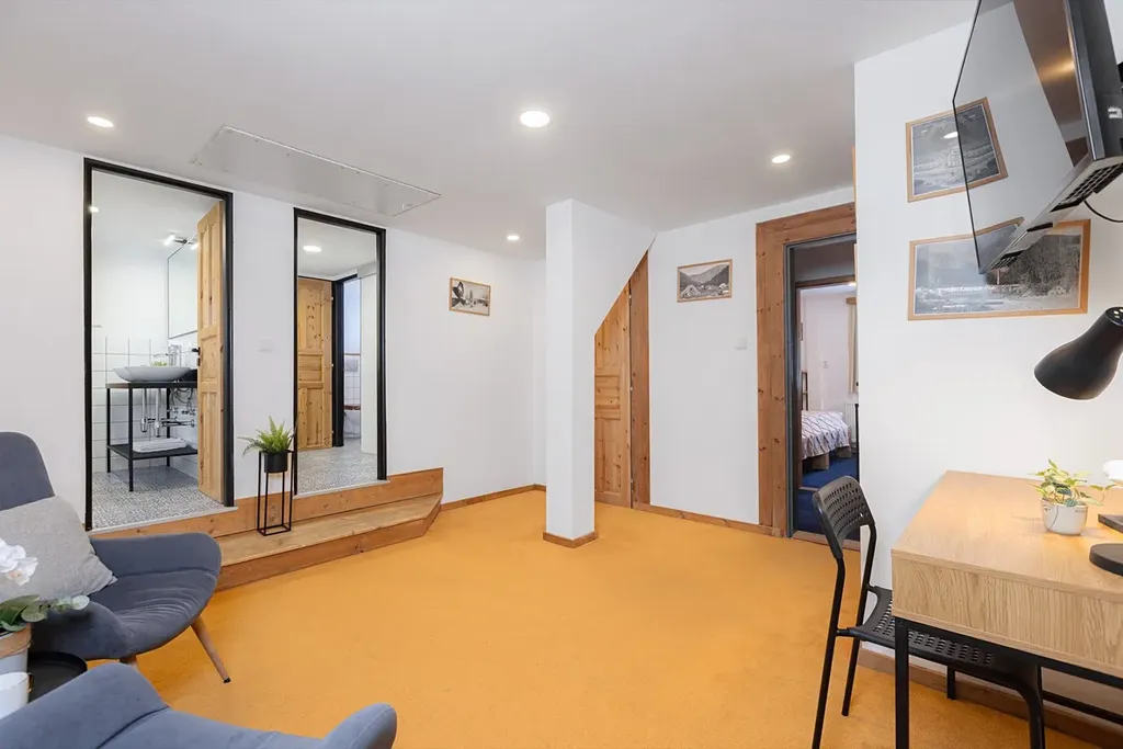 Roubenka, která dostala na frak zejména v dobách minulého režimu, nyní poskytuje soudobý komfort všem hostům. Apartmán 4+kk byl zamýšlen pro vlastní využití majitele domu, přidružen tak k němu byl jihovýchodní výklenek se 4 okny a dechberoucím výhledem do údolí. Prostor jídelny, obýváku a kuchyně doplňuje krb, ovšem primárním systémem vytápění je tepelné čerpadlo umístěné za chalupou. V této části domu jsou pak 3 další ložnice a dvě koupelny, přičemž jsou k dispozici dva samostatné vstupy.