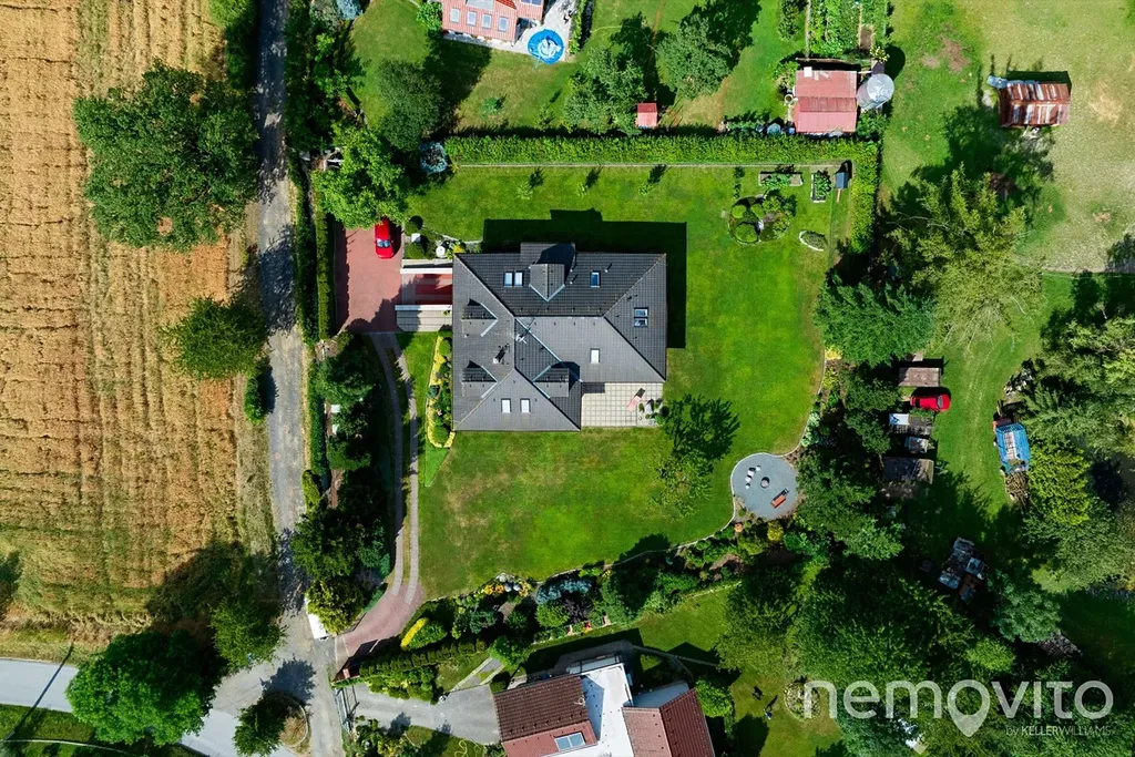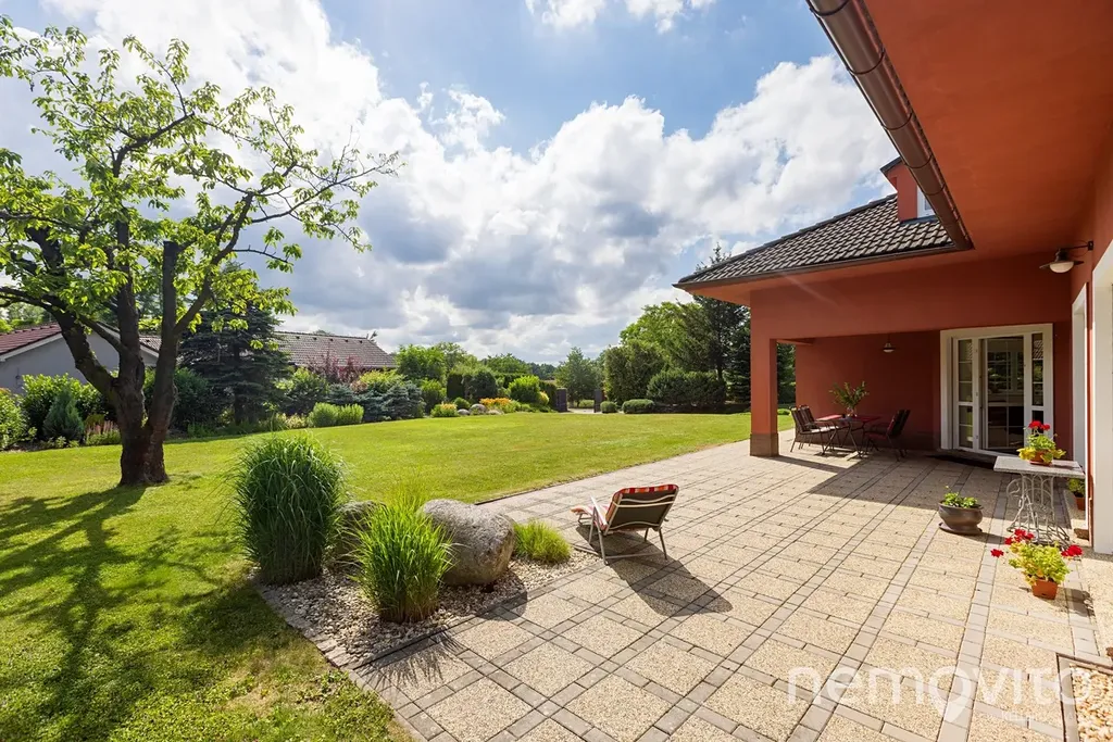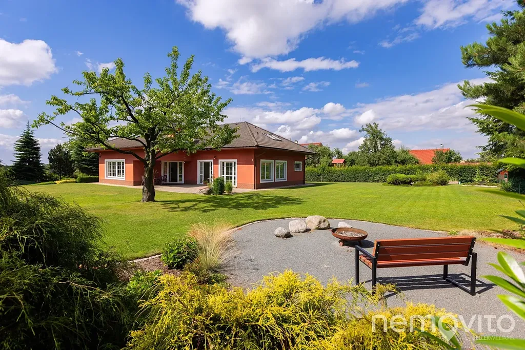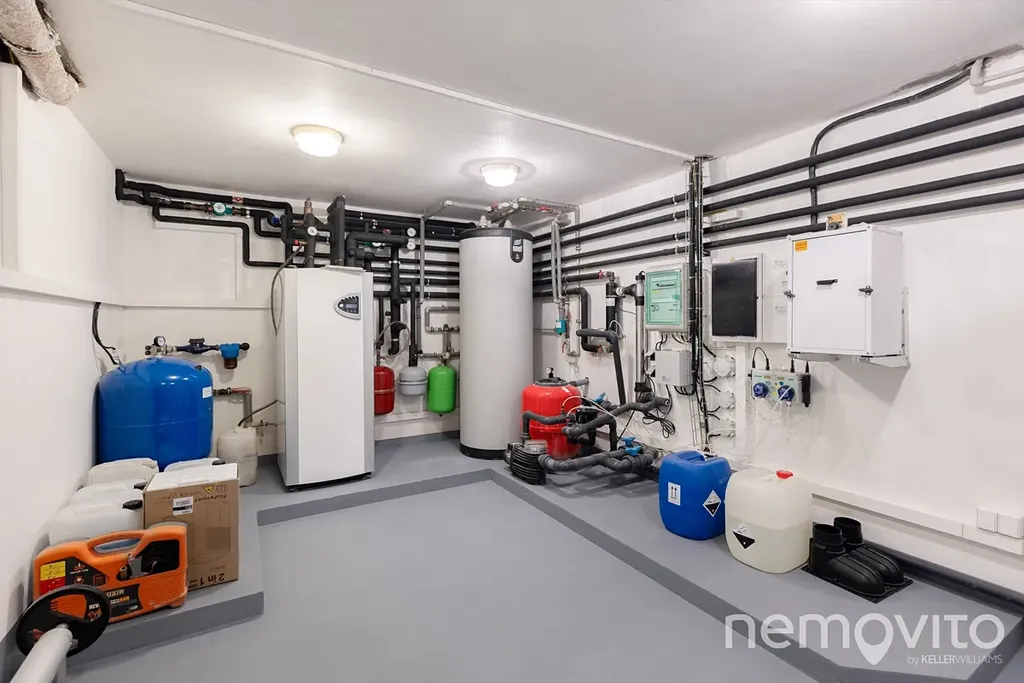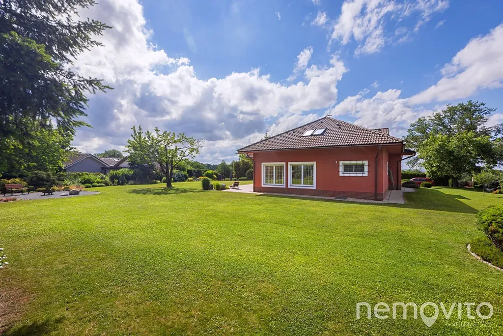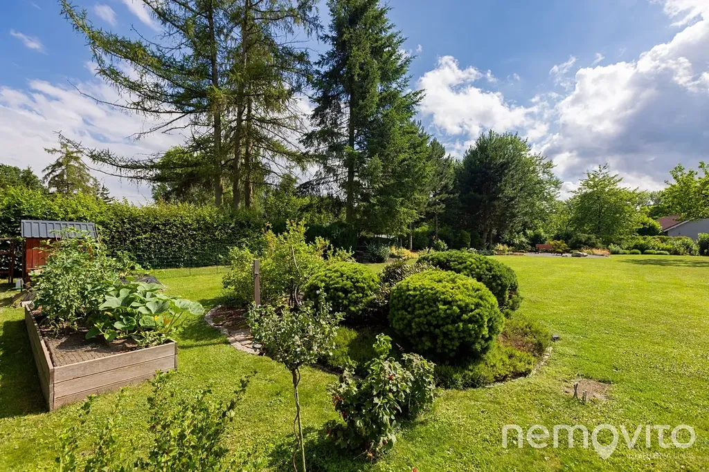 Suterén domu (74 m2) nabízí velkou technickou místnost (jednotka tepelného čerpadla, zásobník na teplou vodu a zázemí k bazénu), dále dva skladovací prostory na chodbě a velkou garáž. Ta je rozdělena na prostor pro auto a dílnu (35 m2), auta však pohodlně zaparkujete na ploše před domem, kam se bez potíží vejde 5 vozů. Velký rovinatý pozemek o velikosti 2.582 m2 je vybaven dvěma studnami a soustavou nádrží na dešťovou vodu. V jeho jižní části se nachází několik vzrostlých stromů a rovněž prostor pro užitkovou část zahrady, která však jinak plní funkci okrasnou.
