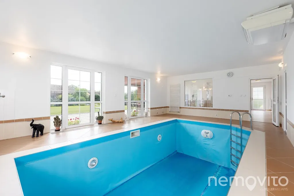 Prostor vnitřního bazénu (47 m2) s dvojicí dveří na terasu a oken je propojený se zázemím spodní koupelny a sauny. Bazén je vybaven technologií protiproudu, místnost lze však pochopitelně po úpravách využít i jiným způsobem. Na spodní koupelnu pak navazuje ještě místnost samostatné prádelny. V přední části domu se u vstupu nachází pokoj pro hosty se šatnou, který jako jediný není vytápěn podlahovým topením (zbytek tohoto podlaží ano).