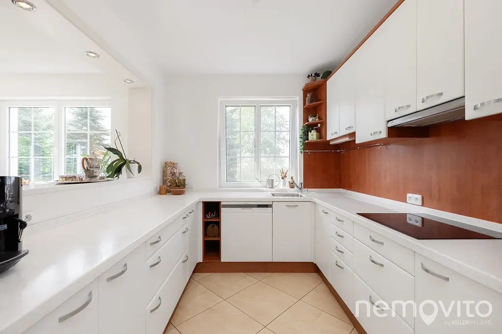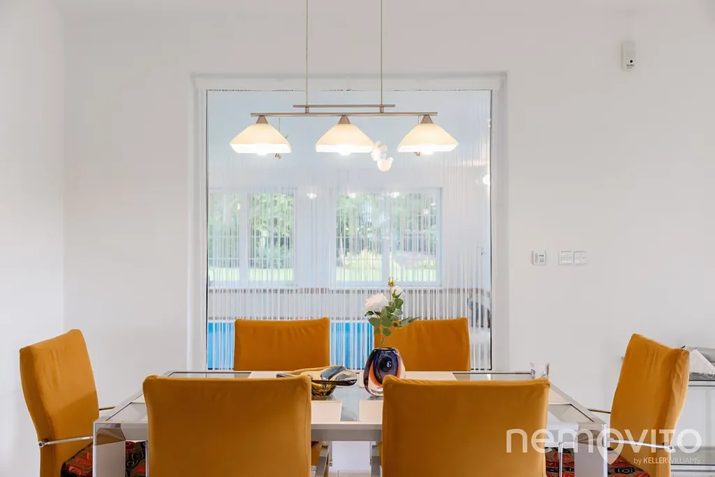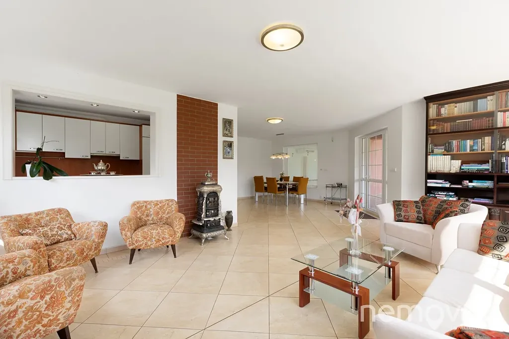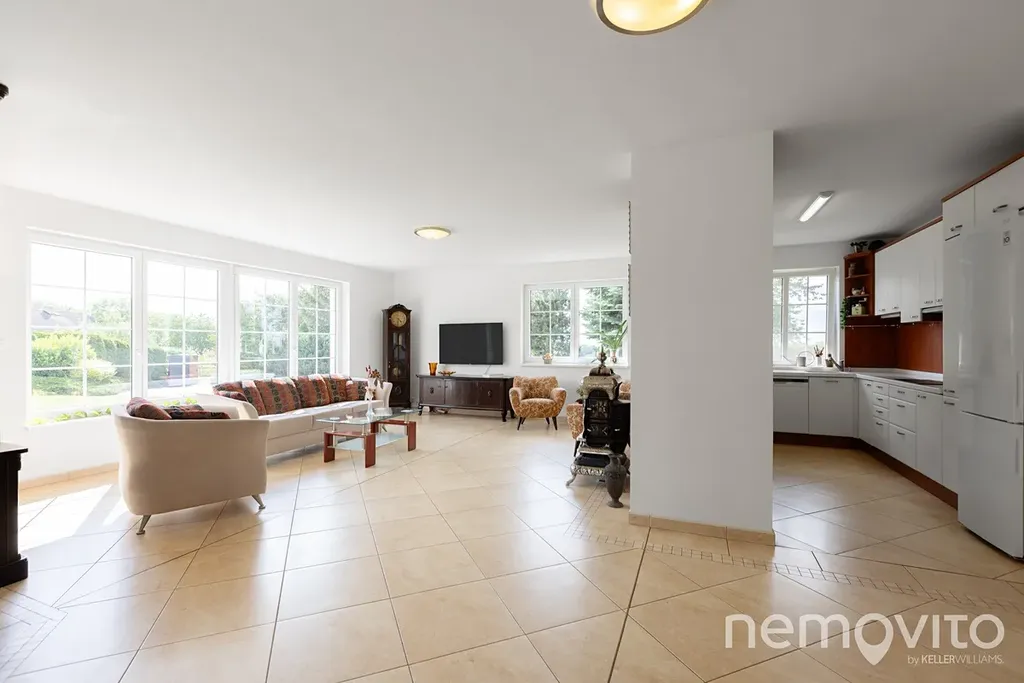 Dominantou prvního podlaží je obývací prostor s průhledem do prostoru s vnitřním bazénem. Zhruba 60 m2 v sobě spojuje prostor pro posezení, jídelnu a kuchyni. Společným jmenovatelem prvního podlaží jsou velká okna, která zejména v prostoru obýváku s kamny poskytují příjemné výhledy do zelené zahrady. Ačkoliv je kuchyně původní, je mimořádně zachovalá, kvalitní (Technistone) a také prostorná (linka do tvaru U s průhledem do obýváku). Prostor pro jídelnu je umístěný u průhledu k bazénu v části s výstupem na terasu.