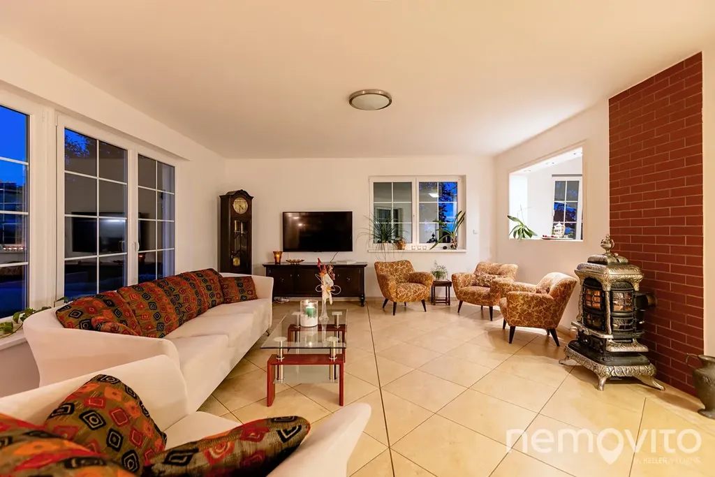 Velký dům na velkém pozemku z roku 2008, který potěší řadou nadčasových řešení a nízkými provozními náklady (15-20 MWh/rok). Konstrukční systém Velox (150 mm monolitický beton se zateplením) se společně s tepelným čerpadlem se zemním kolektorem stará o přijatelné provozní náklady. Stavba v sobě propojuje velkorysost prostor staveb nultých let, kterou však snoubí se soudobou technologií. Třešničkou na dortu je pak mimo vnitřního bazénu a velkého sklepa také skutečně velký pozemek.