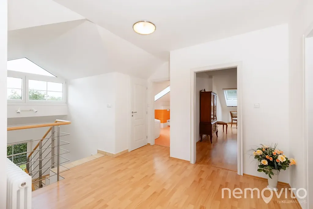 Druhé podlaží, které je přístupné přes široké schodiště, se v horní chodbě (24 m2) otevírá první místností přímo naproti, kterou je samostatná šatna (10 m2). Jelikož byl dům projektován s možností dvougeneračního bydlení, v největším pokoji (45 m2) je možné osadit kuchyni. Druhý největší pokoj (44 m2) je doplněn dalšími dvěma ložnicemi (22 a 19 m2), přičemž na podlaží je k dispozici koupelna se sprchou i vanou a další šatnou.
