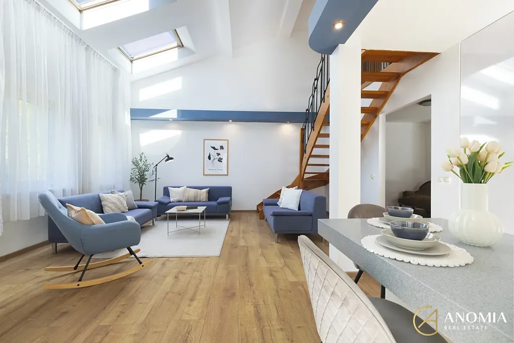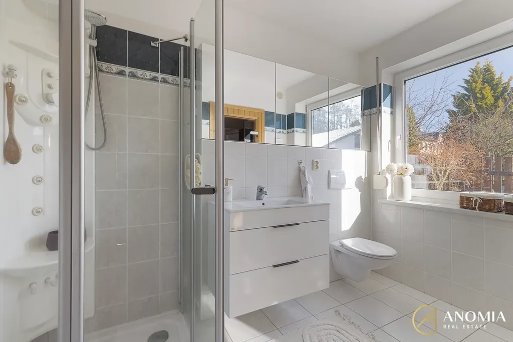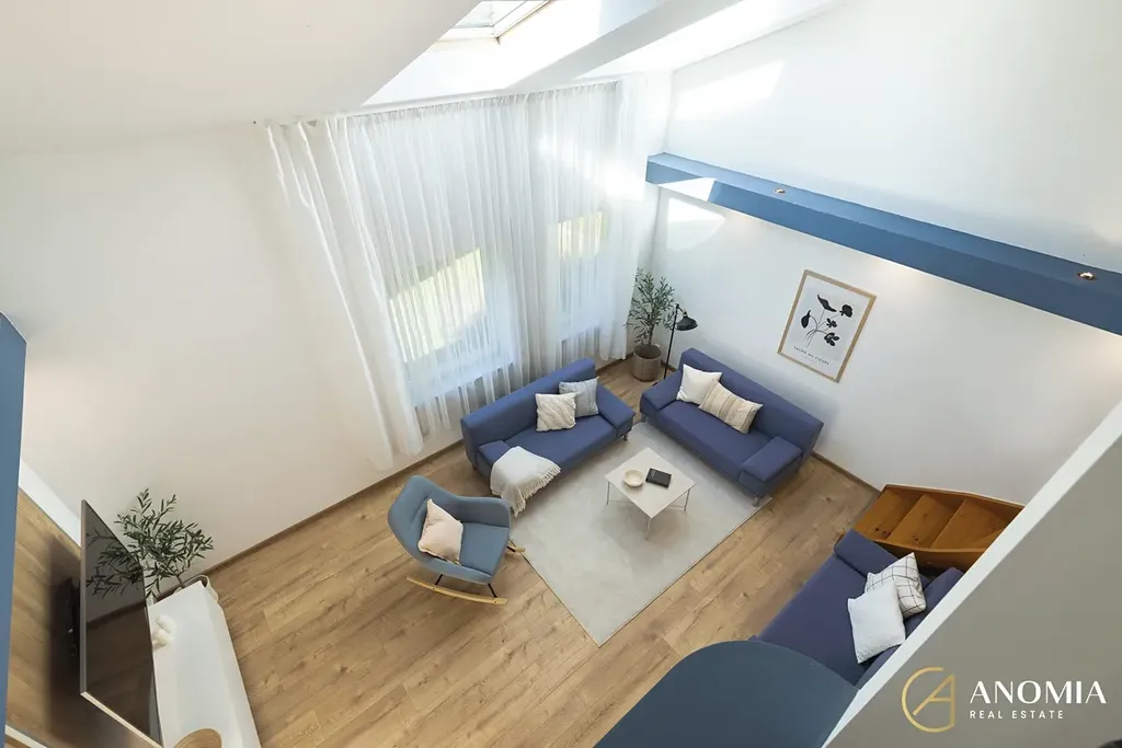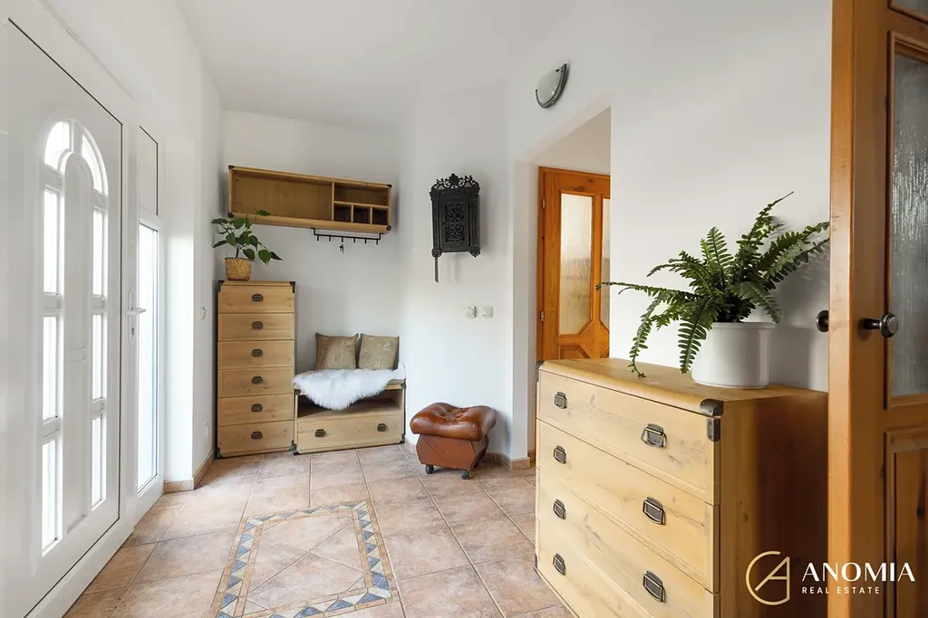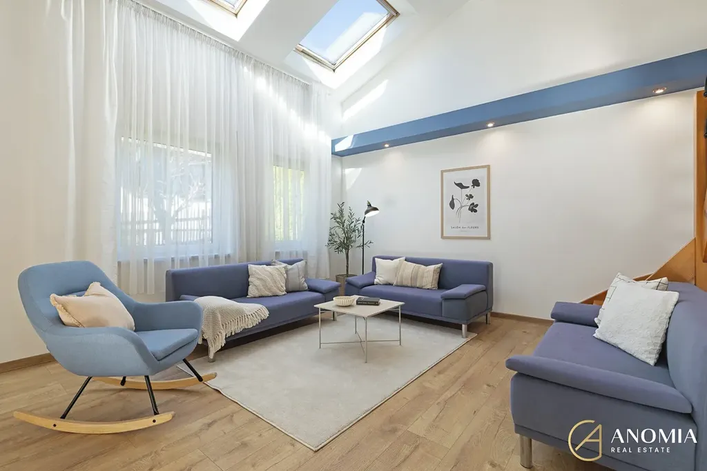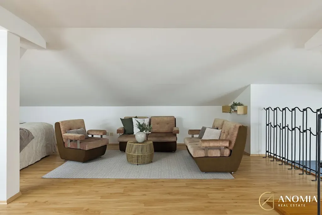 Z obývací části vede schodiště do horního patra, které může sloužit například jako ložnice, pracovna nebo pokoj pro hosty a je propojeno s galerií otevřenou do obytného prostoru. K dispozici jsou také další dva samostatné pokoje. Součástí domu je koupelna s finskou saunou a nechybí ani relaxační místnost s vířivkou, odkud se díky velkým francouzským oknům otevírá příjemný výhled do zahrady. Praktickým zázemím domu je také technická místnost v přízemí a půdní prostor v patře, který nabízí další úložné možnosti.