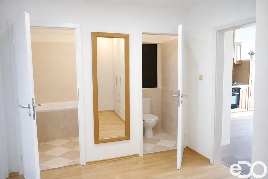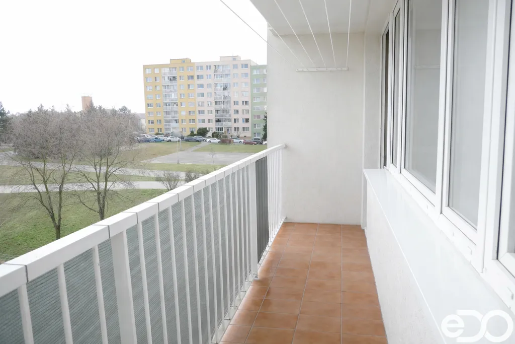 Dispozice zahrnuje prostorný obývací pokoj s kuchyňským koutem, dvě samostatné ložnice, koupelnu s vanou a samostatné WC. Z obývacího pokoje je přímý vstup na lodžii.