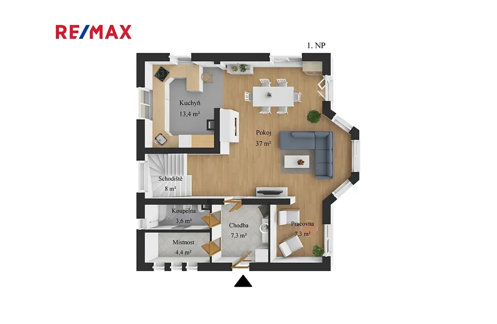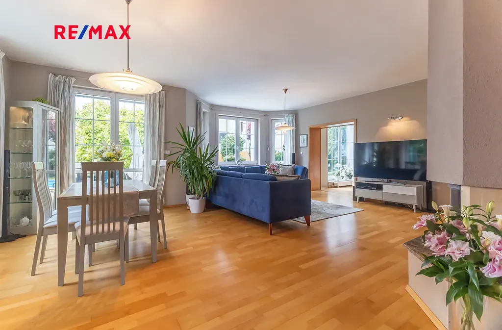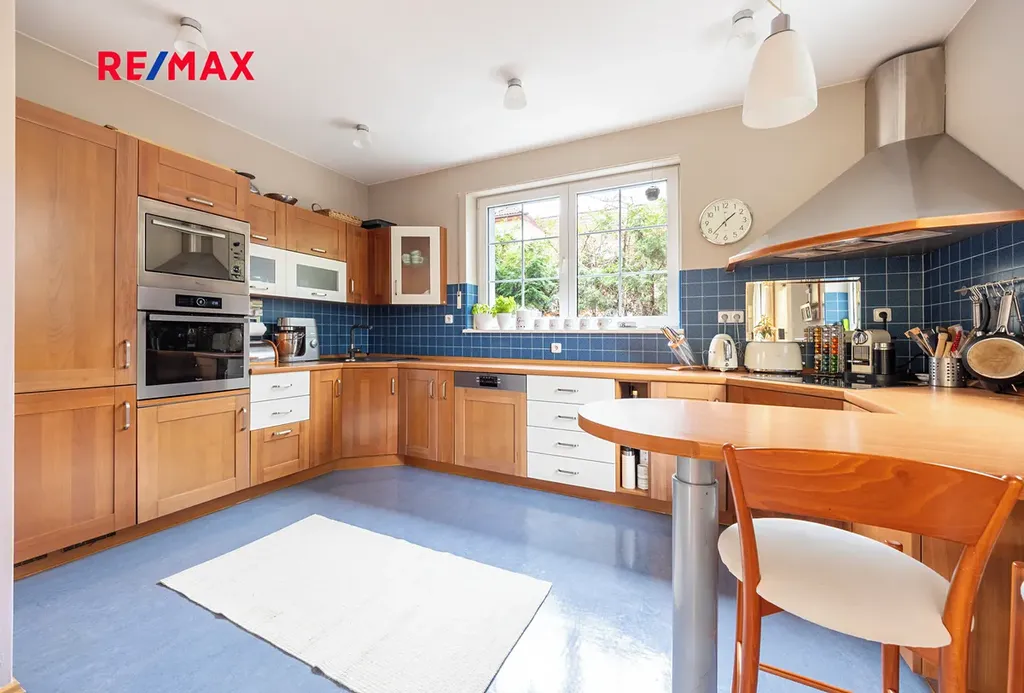 Dominantou přízemí je prostorný obývací pokoj propojený s jídelnou, pracovnou a kuchyní, který tvoří přirozené centrum domu. Kuchyň je vybavena kvalitní italskou kuchyňskou sestavou CESAR se zánovními spotřebiči. Interiér doplňují designová italská svítidla, dřevěné podlahy a poctivé na zakázku vyrobené masivní schodiště, které potěší každého milovníka kvalitního truhlářského řemesla.