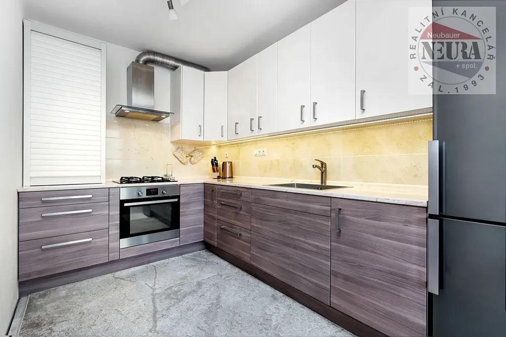 moderní kuchyňská linka je vybavena plynovým sporákem, horkovzdušnou troubou s grilem, lednicí s mrazákem a digestoří; je zde připravena instalace pro myčku (lze pořídit), bytové jádro je zděné, okna jsou plastová se žaluziemi, v celém bytě je položena bezbariérová plovoucí podlaha s přechodovými lištami mezi pokoji, jediný nízký práh je u vstupních dveří do bytu, v koupelně a WC dlažba, lodžie je zasklená a opatřená dlažbou, vytápění i ohřev vody jsou řešeny dálkově, internet je k dispozici prostřednictvím kabelového připojení,