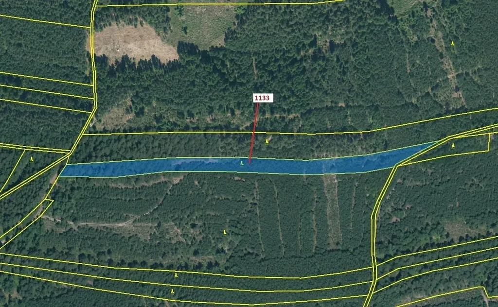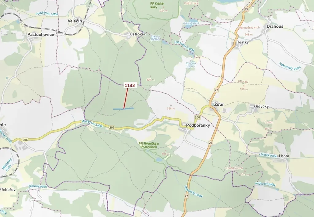 Lesní pozemek o výměře 7 895 m2, parcelní číslo 1133, podíl 1/1, katastrální území Podbořánky, obec Jesenice, obec s rozšířenou působností Rakovník, okres Rakovník, Středočeský kraj. Částečně po těžbě.