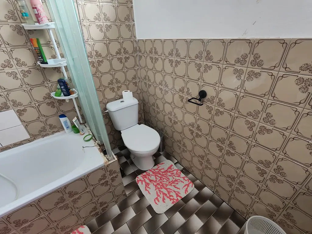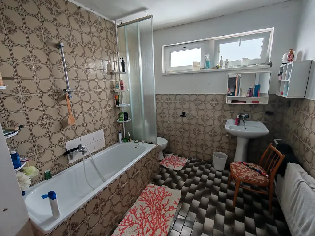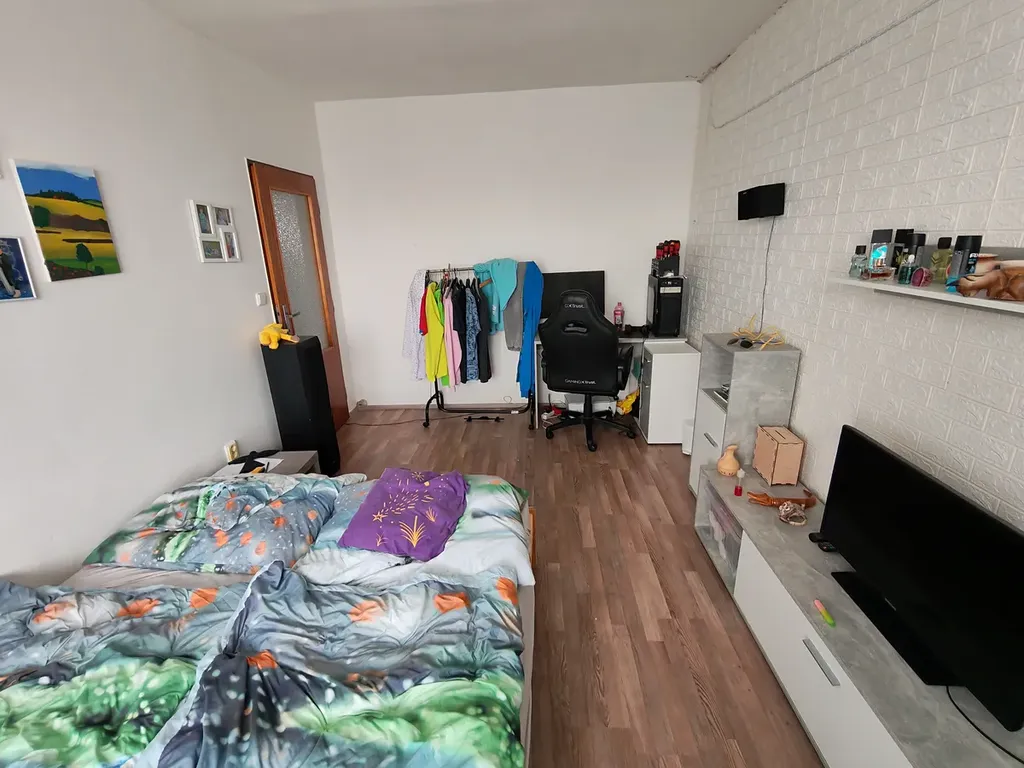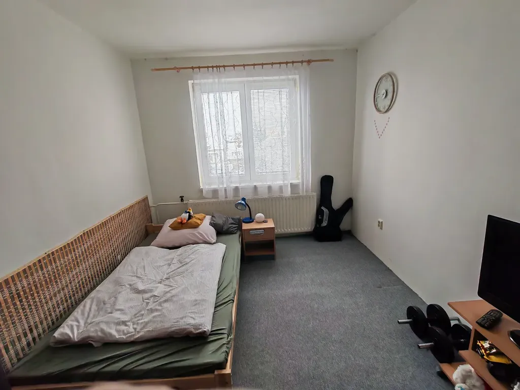 v 1.P. je pěkný prostorný obývací pokoj s kuchyňským koutem, ložnice a koupelna s vanou a WC.