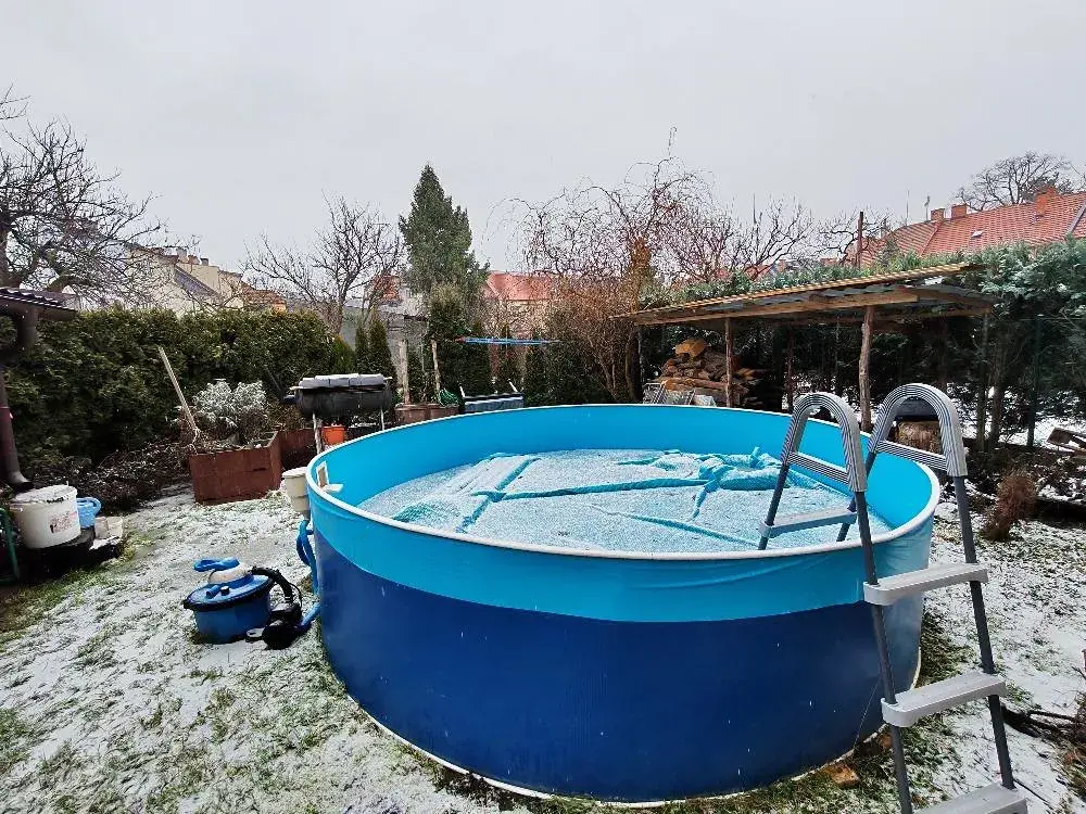 Plocha okolního pozemku = zahrady je 121 m², což je dostatečné pro relaxaci i drobné zahradnické práce. Součástí zahrady je pergola s posezením a bazén.