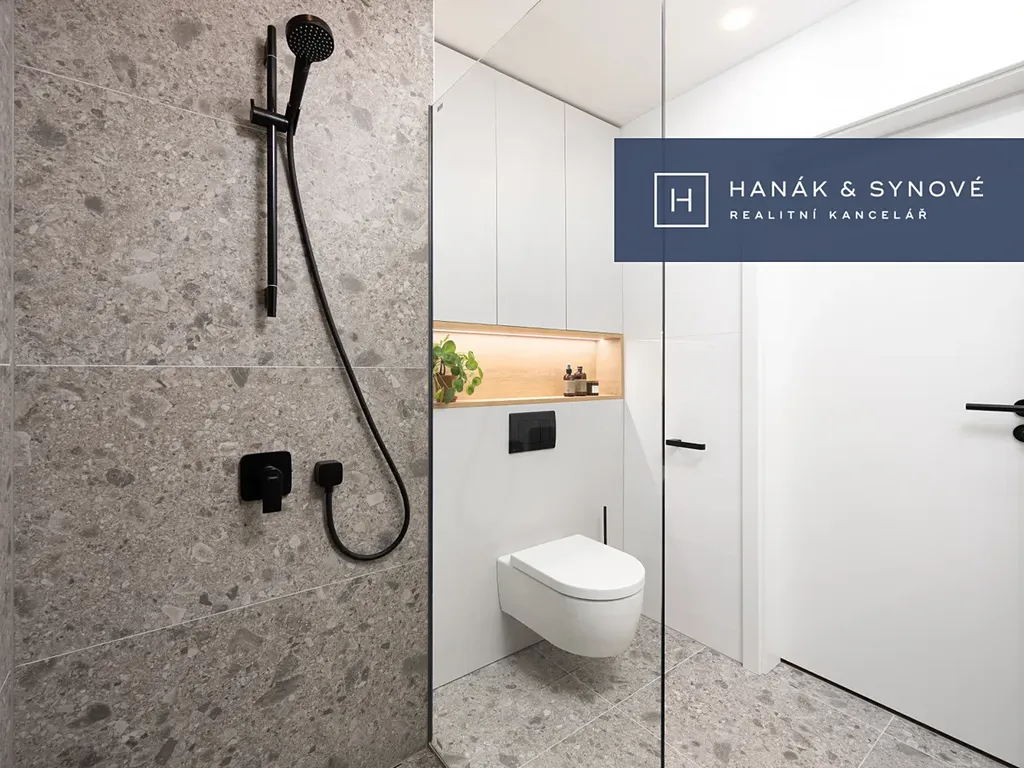 Byt je zařízený ve vysokém standardu a je nabízen plně zařízený – kuchyňská linka se spotřebiči (varná deska, mikrovlnná trouba, vestavěná lednice s mrazákem, trouba, myčka, pračka se sušičkou), vestavěná skříň, postel, stůl, venkovní žaluzie. Koupelna je vybavena walk-in sprchovým koutem se skleněnou zástěnou značky HÜPPE, záchodem a umyvadlem s umyvadlovou skříňkou, podsvíceným zrcadlem.