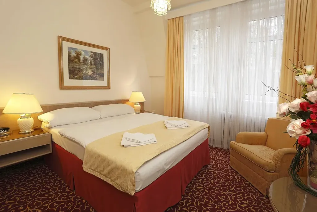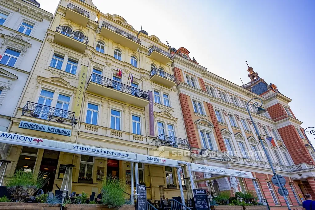 Tato impozantní budova s celkovou plochou 6 150 m² byla postavena v roce 1893 v historizujícím stylu s prvky klasicismu, který je naprosto typický pro lázeňskou architekturu konce 19. století. Hotel aktuálně disponuje 32 pokoji ve čtyřech různých kategoriích, od menších pokojů typu Economy až po prostorný Suite. Součástí objektu je také celodenní restaurace o velikosti 86 až 105 m² umístěná v přízemí, ke které náleží sezónní venkovní terasa s krásným výhledem na promenádu. Prostory restaurace jsou navíc naprosto ideální pro pořádání soukromých akcí, pro které ji lze exkluzivně zarezervovat.