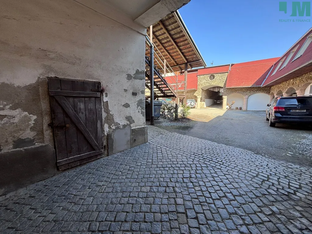 Celý areál je za uzavřenou bránou s elektronickým ovládáním. Uvnitř najdete nejen parkování, ale i příjemné místo k odpočinku – lavičku, stůl a prostor třeba na grilování.