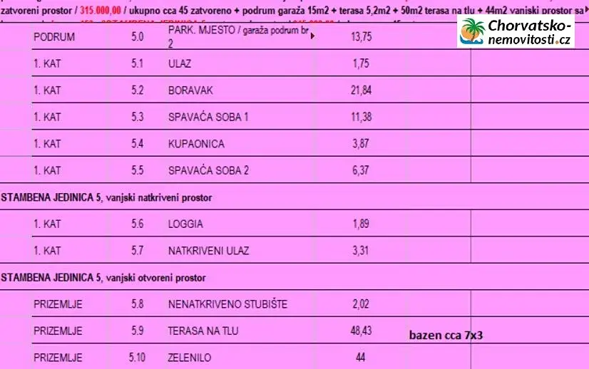 Chorvatsko-Nemovitosti.cz nabízí dvou pokojový plážový(dvě ložnice a hlavní pokoj s kuchyní) apartmán (S5) o rozloze 45 m2. Se nachází v prvním patře domu(novostavby), pouze 350 metrů od pláže. Má terasu s výhledem na okolí a moř, je klimatizovaný a krásně vybavený. Apartmán má vlastní dvůr a přímý přístup k bazénu. Před apartmánem jsou parkovací místa pro váš vůz(i elektro nabíječky na auta).