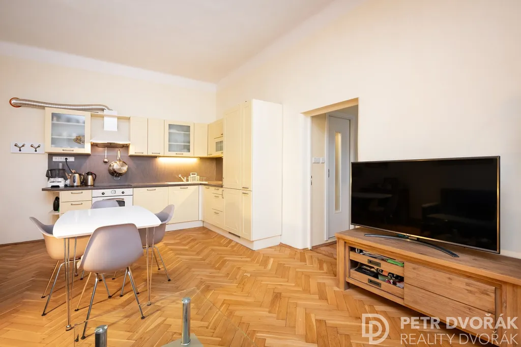 Navazuje velký obývací pokoj s kuchyňským koutem a dvěma prostornými kastlovými okny s hlubokými špaletami do starobylé Haštalské ulice, jedné z nejautentičtěji zachovaných středověkých ulic Prahy. Kuchyň je vyrobena na míru a zahrnuje vestavěnou lednici s mrazákem, myčku, elektrickou troubu i varnou desku. Podlahy tvoří původní parkety, nově renovované v roce 2024.