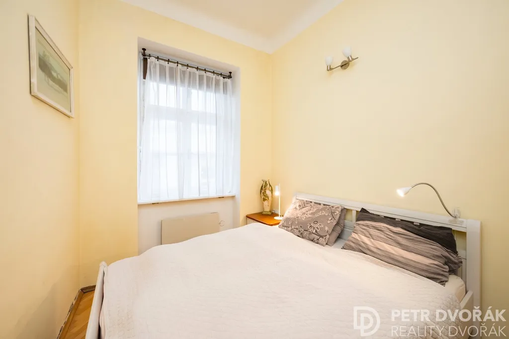 Z obývacího pokoje se vstupuje do ložnice, kde velkorysá kastlová okna s hlubokými špaletami pokračují ve svém dialogu s historickou ulicí, a přilehlou koupelnou se sprchovým koutem, toaletou a pračkou. K bytu náleží vlastní sklepní kóje 1,5 m².