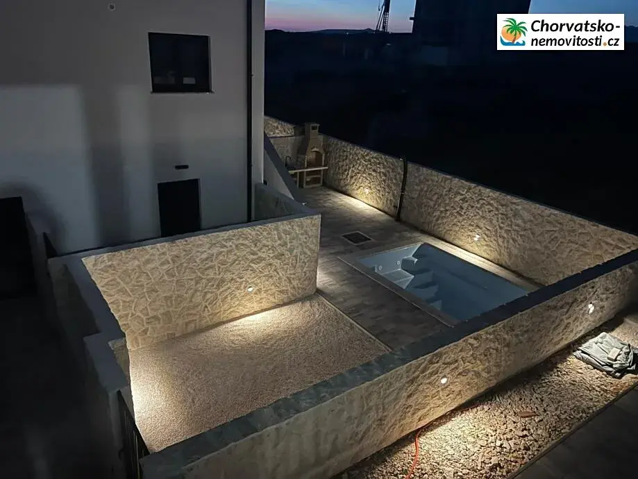 Z bytu vedou schody dolů do dvora 76,46, kde je bazén a kamenný gril.