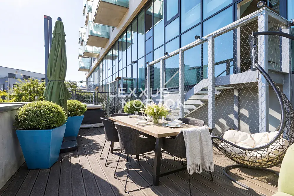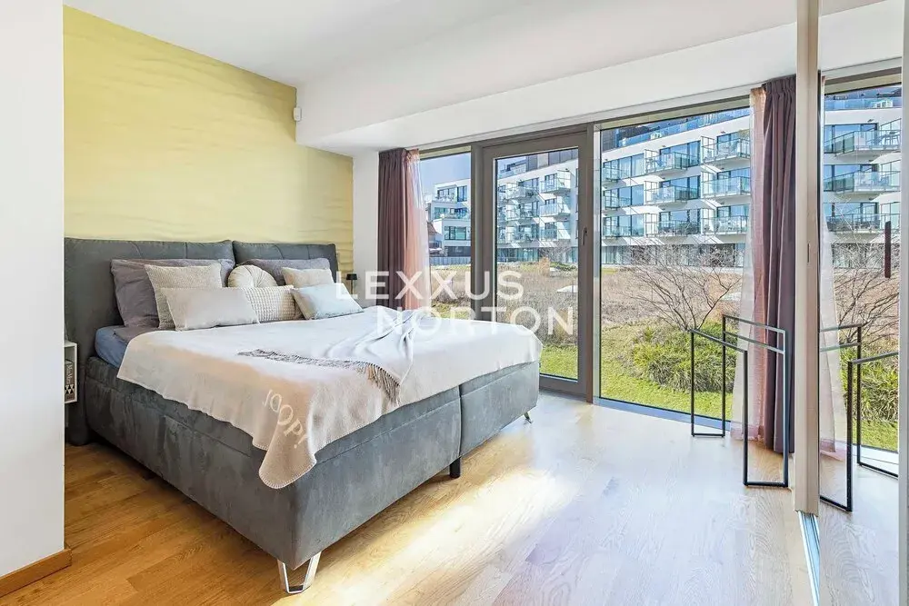 Byt je kompletně zařízen a připraven k okamžitému užívání. Kuchyňská linka je vybavena vestavěnými spotřebiči značky AEG. Součástí prodeje je také veškerý nábytek, televize, pračka, sušička, klimatizace i venkovní posezení s vířivkou na terase. K bytu je také možné dokoupit parkovací stání.