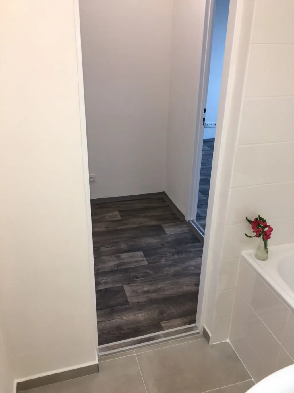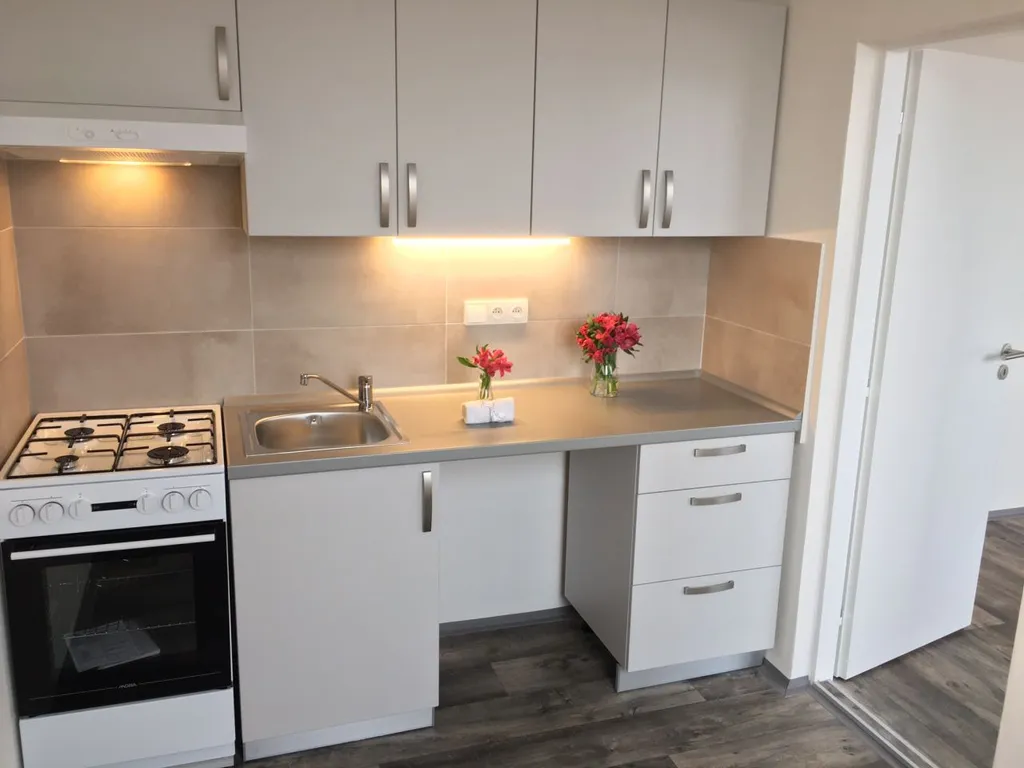 Byt prošel rekonstrukci v roce 2021 a má vyzděné jádro, podlahy, rozvody, omítky, interiérové dveře. Koupelna s vanou a umyvadlem, toaleta je součástí koupelny. Kuchyňská linka je opatřena plynovým sporákem a elektrickou troubou s možností připojení pračky.