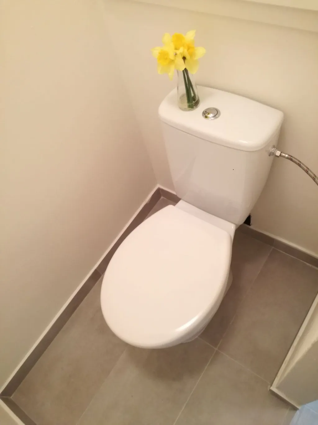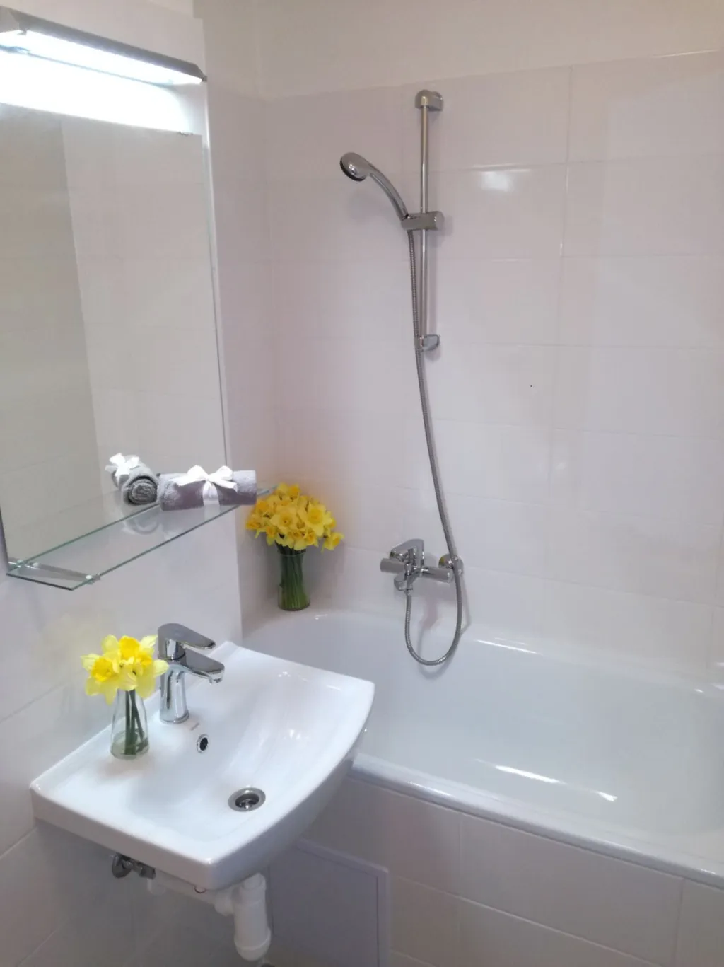 Koupelna s vanou a umyvadlem s možností připojení pračky, toaleta je součástí koupelny oddělena přepážkou.