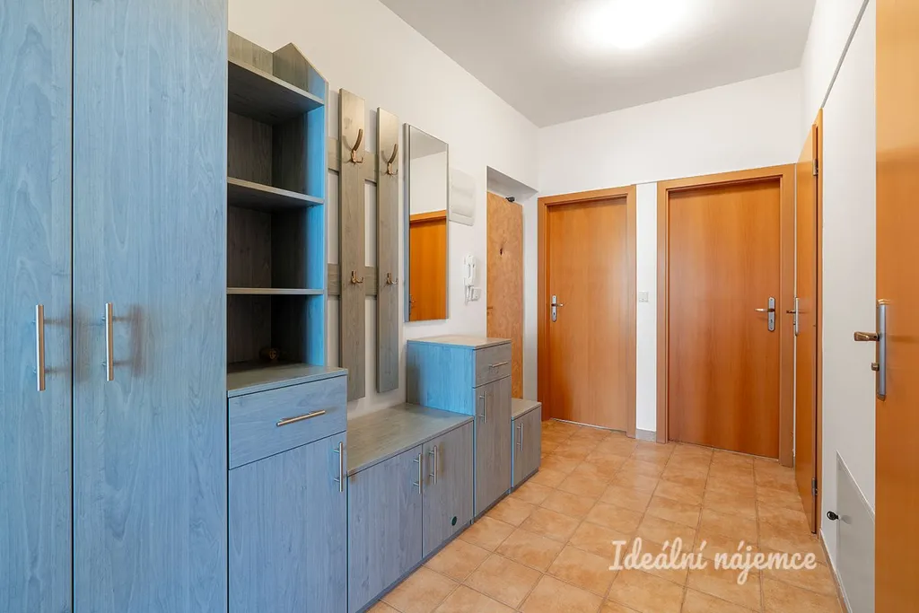 Skládá se z centrální vstupní chodby, dětského pokoje, ložnice, samostatné koupelny s vanou i sprchovým koutem, pračkou a umyvadlem, toalety a obývacího pokoje společného s kuchyňským koutem a vstupem na prostorný balkon. Velkou výhodou bytu jsou jeho úložné prostory v celkem 2 vestavné šatní skříně a sklep.