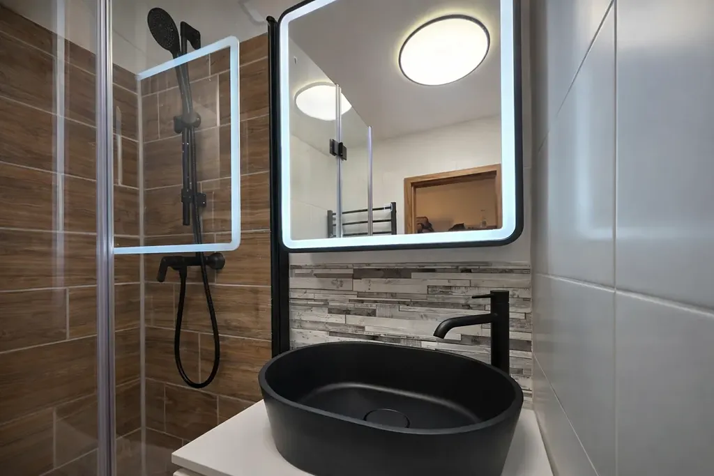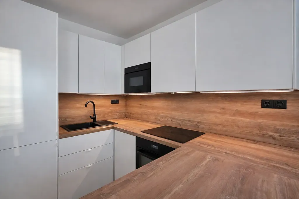 Dominantou interiéru je designová kuchyňská linka na míru, vybavená kvalitními vestavěnými spotřebiči – indukční varnou deskou, horkovzdušnou troubou, mikrovlnnou troubou s parním ohřevem, myčkou nádobí a lednicí s mrazákem. Celek působí nadčasově, elegantně a zároveň maximálně prakticky.
