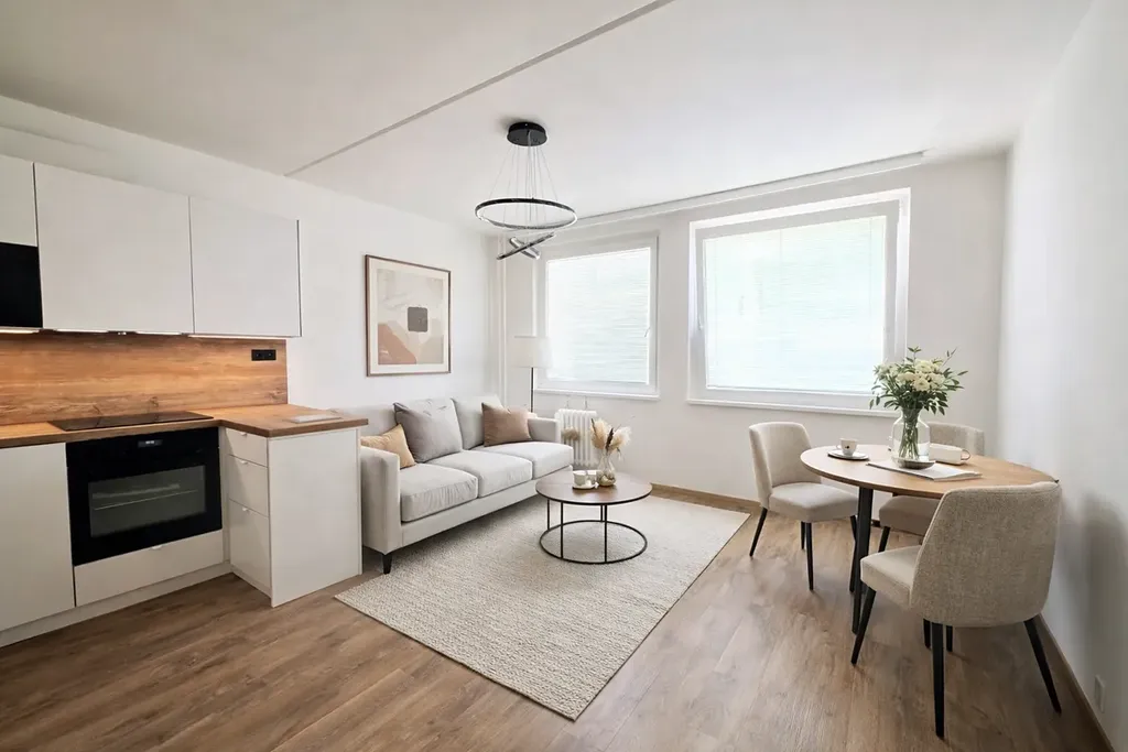 Exkluzivně nabízíme výjimečný, kompletně zrekonstruovaný byt s lodžií, který spojuje moderní design, funkčnost a jedinečnou atmosféru. Byt se nachází v 8. patře s atraktivní západní orientací, která zajišťuje dostatek přirozeného světla a dechberoucí výhled na panorama Žižkova.
