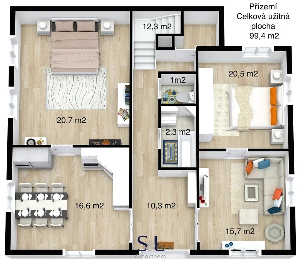 Podkroví – 4 pokoje, kuchyň, chodba a úložné prostory (část plochy se sníženou výškou).