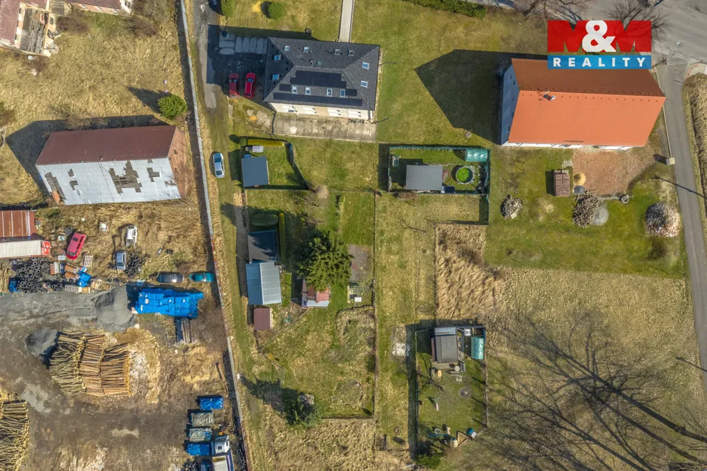 Na pozemku se nachází přístřešek a plechové zahradní domky.