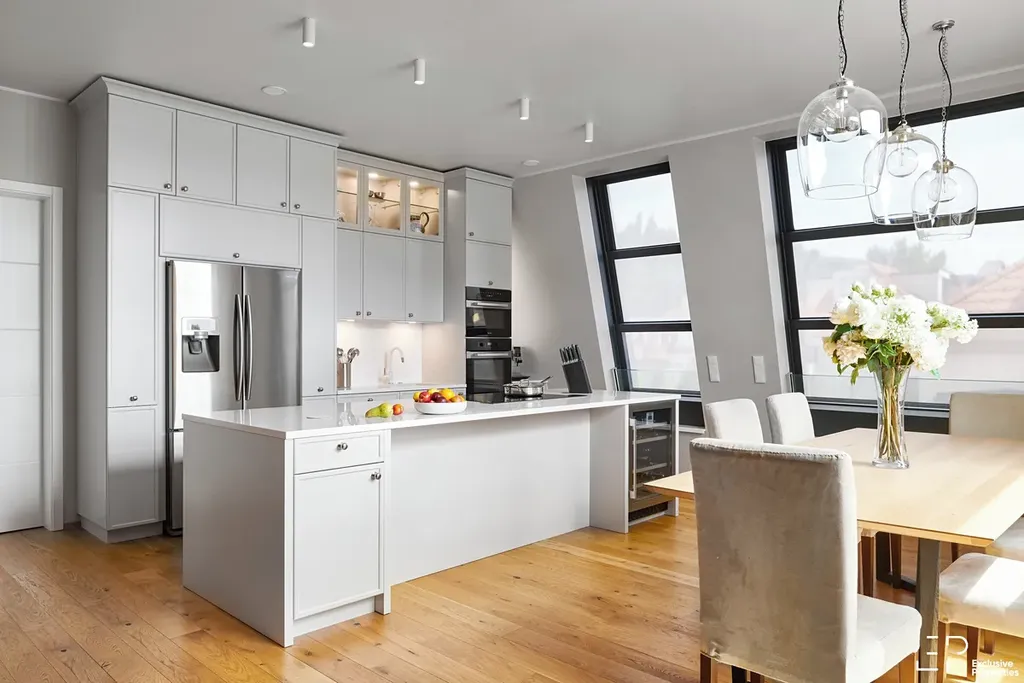 Dominantou bytu je prosvětlený, velkorysý, obývací prostor s kuchyní a jídelní částí (62m2), který plynule navazuje na jižně orientovanou terasu (12,8m2). Propojení interiéru s exteriérem vytváří harmonické prostředí pro každodenní život i chvíle odpočinku. Interiérový vestavěný nábytek je zde kompletně realizován na míru s důrazem na detail, funkčnost a čistotu designu – vše od společnosti Hanák. Knihovna s TV stěnou v obývací místnosti a kuchyňská linka ve světle šedivé barvě jsou v kuchyni doplněny bílou deskou (Technistone), čímž vzniká jednotný a nadčasový vizuální koncept. Samozřejmostí jsou spotřebiče Miele s elektricky vyjíždějící digestoří a vinotéka.
