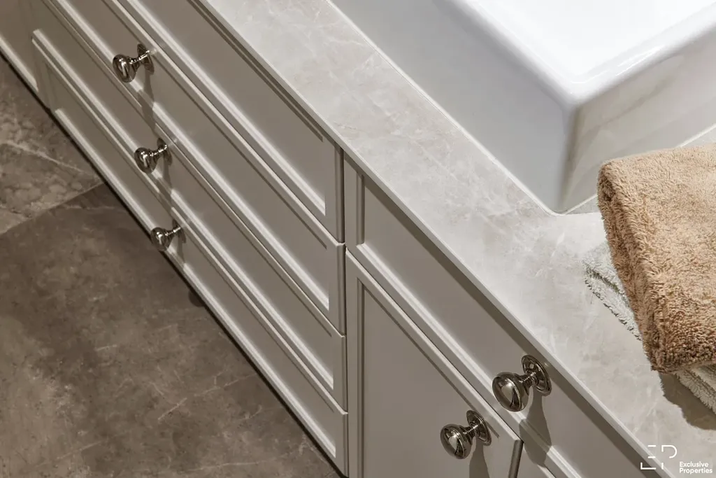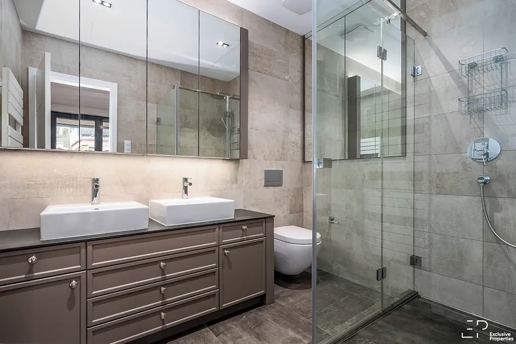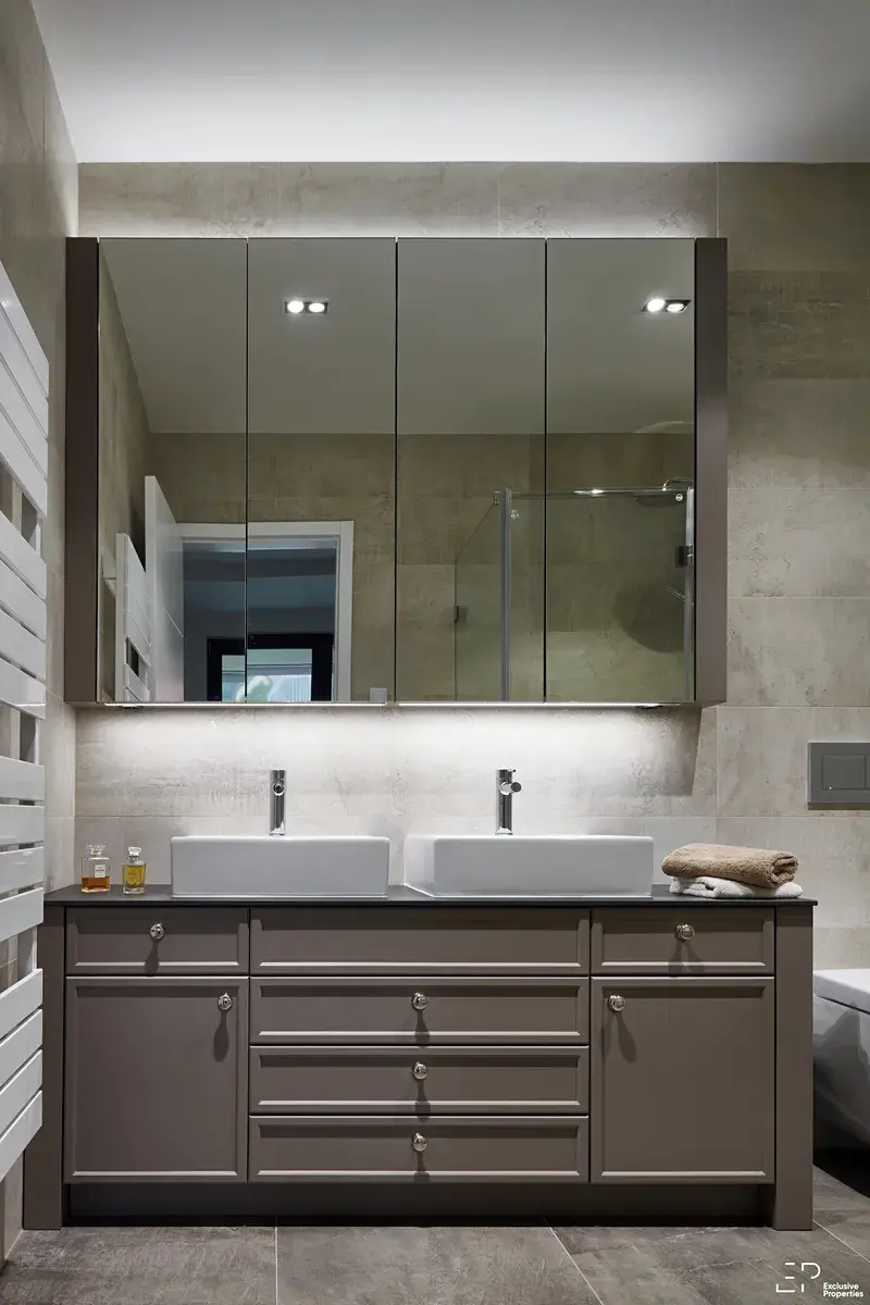 Hlavní ložnice disponuje vestavěnými skříněmi, vlastní koupelnou a privátní terasou (12,8m2) orientovanou na SV. Další dvě ložnice jsou rovněž vybaveny vestavěným nábytkem a doplněny druhou koupelnou s vanou a s sprchovým koutem a dvěma umyvadly. Ve vstupní hale se nachází elegantní vestavěné skříně v anglickém stylu od Divine Furniture ve slonovinové barvě, dále technická místnost s prádelnou a samostatná toaleta.