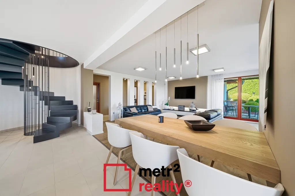 Jedinečná stavba zasazená do okrasné zahrady na okraji lesa – světlé interiéry, velkorysá dispozice a výhled, který vás každý den potěší. Originální dům s kruhovým schodištěm, velkým posuvným oknem v ložnici a přímým propojením interiéru se zahradou a okolní přírodou.