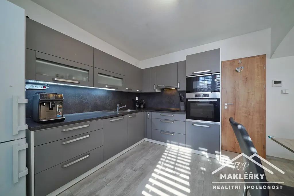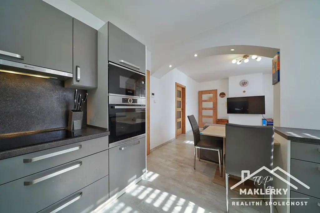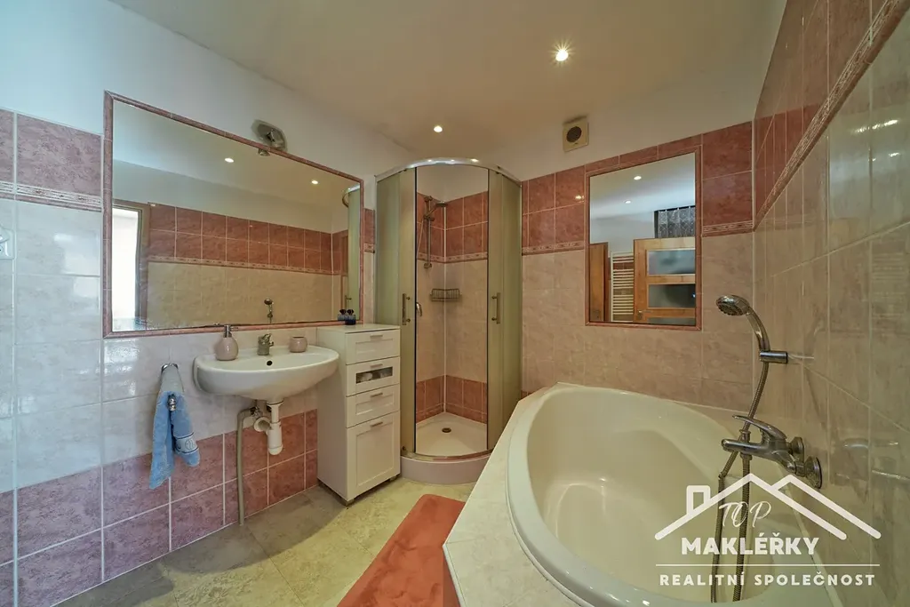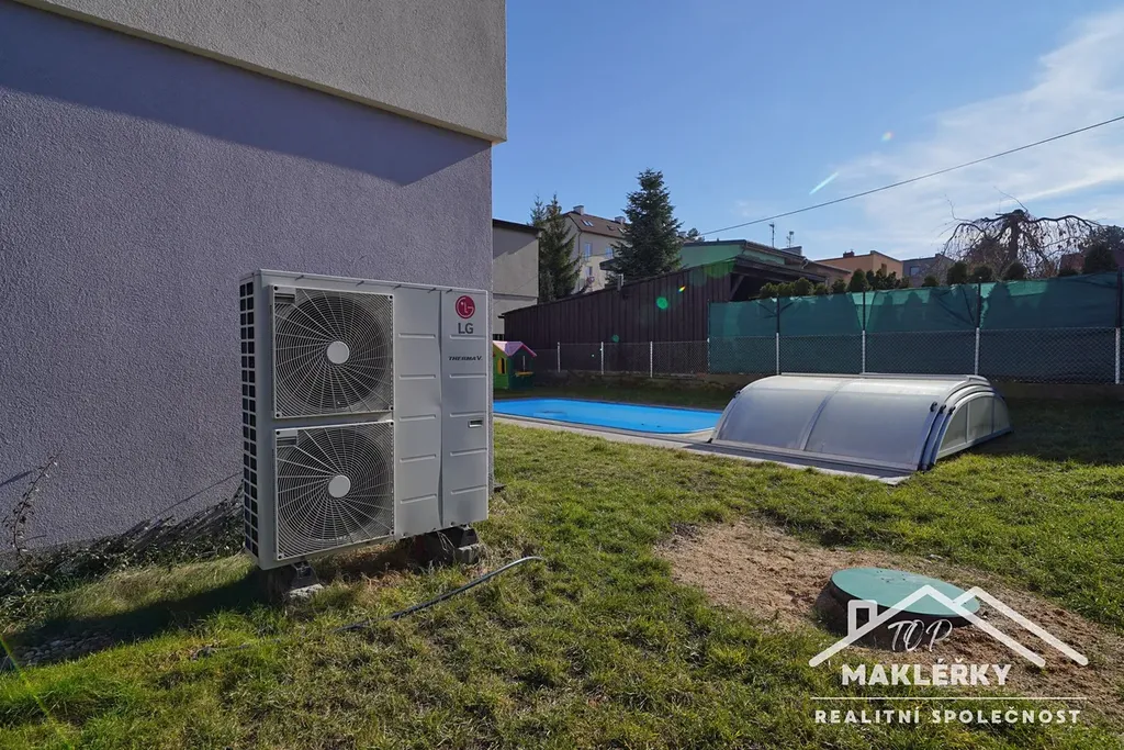 V zadní části u domu je hliníková pergola s otočnými lamelami (jednu stranu lze zastínit stahovací přepážkou) a bazén 3x6m. Střecha rovná, plechová. Do garáže je vstup pouze zvenčí.