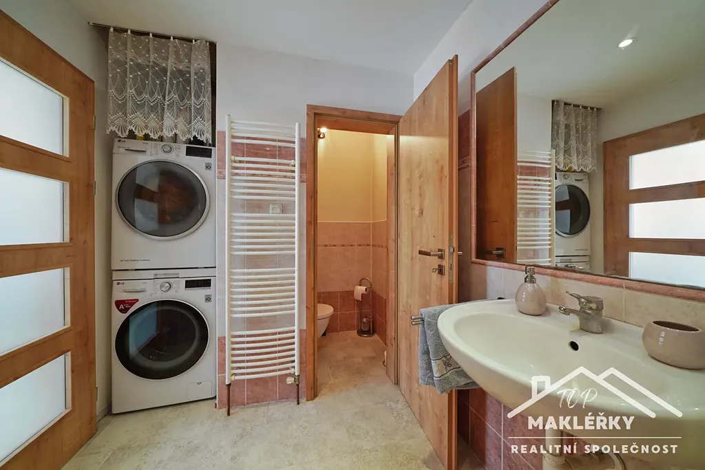 chodba se schody s dřevěným zábradlím do patra protínají celý dům a vedou opět ven, pod krytý prostor pergoly. Vpravo je umístěná ložnice, následně obývací pokoj menších rozměrů, propojený s kuchyní (spíž). Mezi sebou mají obloukový vchod bez dveří. V celé místnosti jsou různá poziční světla. Odsud vedou dveře do koupelny s WC, sprchovým koutem, vanou a umyvadlem). V jídelně, kuchyni a spodní koupelně - je částečně podlahové topení - hřeje, ale nelze jej ovládat - je zalité v betonu pod vinylem.