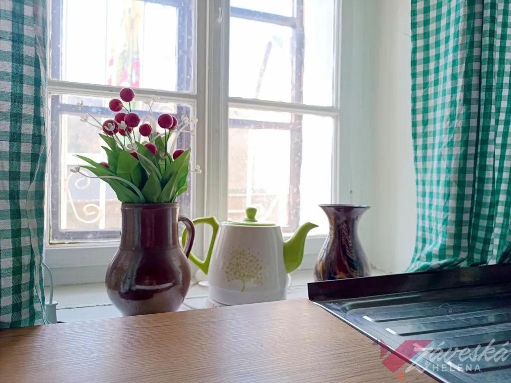 Na první pohled vás zaujme dominanta této místnosti, dobová výhřevná kachlová kamna na dřevo