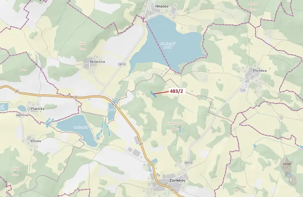 Lesní pozemek o výměře 2895 m2, parcelní číslo 483/2, podíl 1/1, katastrální území Zavlekov, obec Zavlekov, obec s rozšířenou působností Klatovy, okres Klatovy, Plzeňský kraj. Po těžbě.