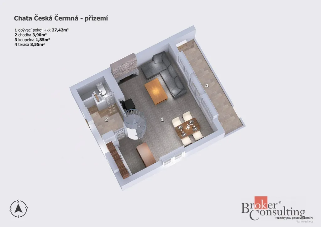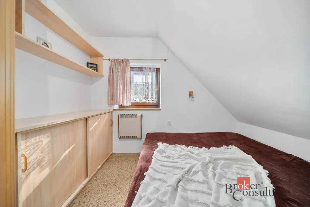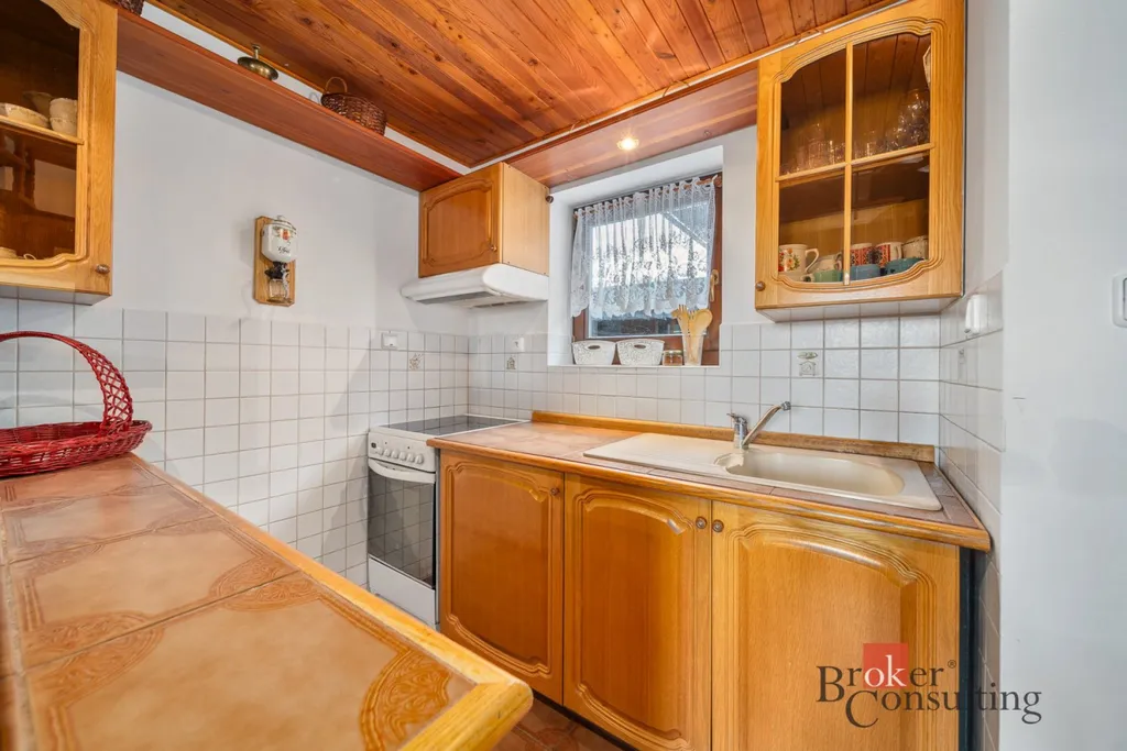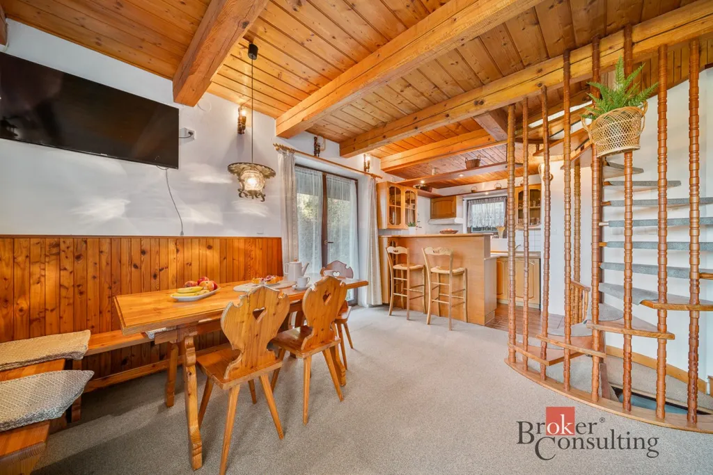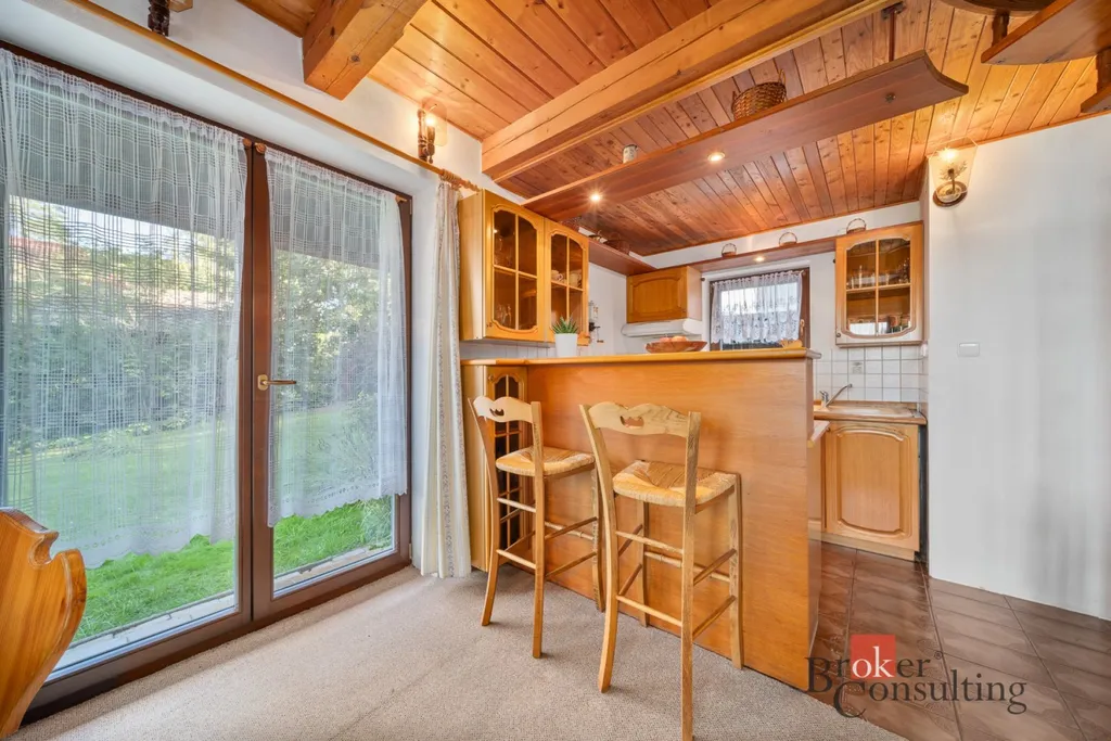 V přízemí se nachází kuchyně spojená s obývacím koutem a jídelním stolem. Z obývacího pokoje je přímý vstup na slunnou terasu, kde si vychutnáte ranní kávu nebo večerní posezení. V podkroví jsou tři útulné pokoje a balkon s nádherným výhledem do okolní přírody.