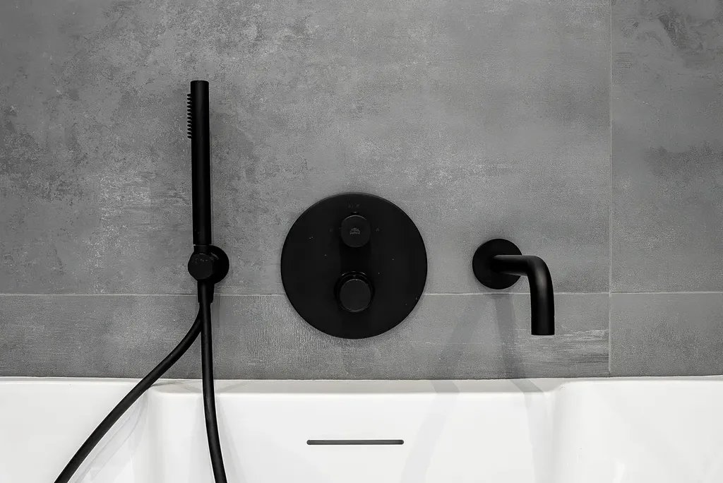 Koupelny s italskou velkoformátovou dlažbou a podomítkovými bateriemi působí elegantně, přitom funkčně.