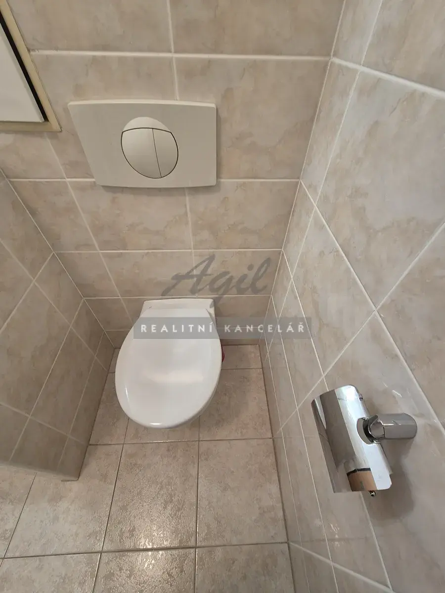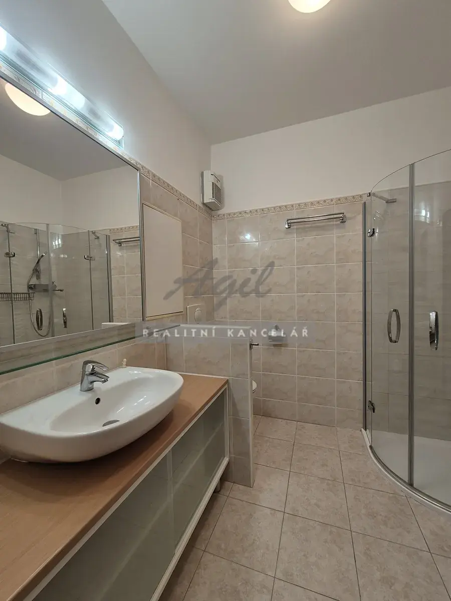 Koupelna – umyvadlo, nástěnná skříňka se zrcadlem a osvětlením, vana, sprchový kout, WC, elektrický žebřík, přípojka na pračku, pračka.