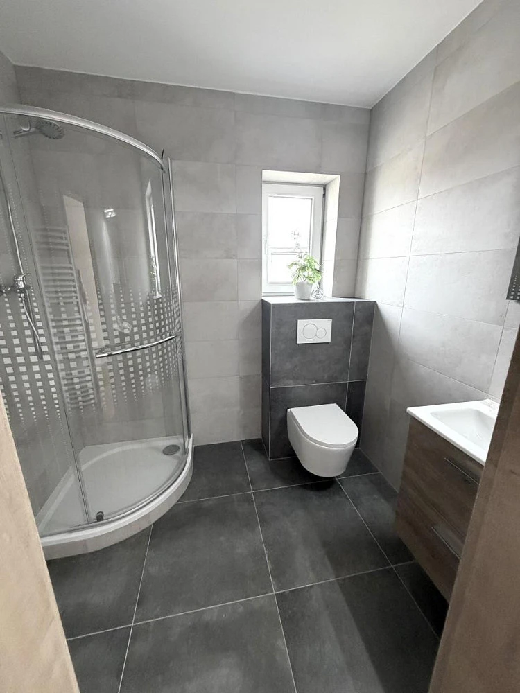 Vstupními dveřmi vejdeme do vstupní haly o celkové výměře cca 4,80 m². Z této je vstup do ostatních místností v bytě. Dominantou celé bytové jednotky je obývací pokoj s kuchyní o výměře cca 22,55 m². Z obývacího pokoje bude vstup na zahradu, která bude součástí pronájmu. Zahrádka bude oplocená a její plocha bude cca 90 m². V obývacím pokoji s kuchyní je nová kuchyňská linka vybudovaná na míru, která je vybavena troubou, lednicí s mrazákem, myčkou, digestoří a sporákem. Koupelna je také atypická a její výměra činí cca 4,80 m². V koupelně je sprchový kout, WC, umyvadlo se zrcadlem a skříňkou. Další obytnou místností je pokoj o výměře cca 15,80 m², který je přímo ideální jako ložnice.